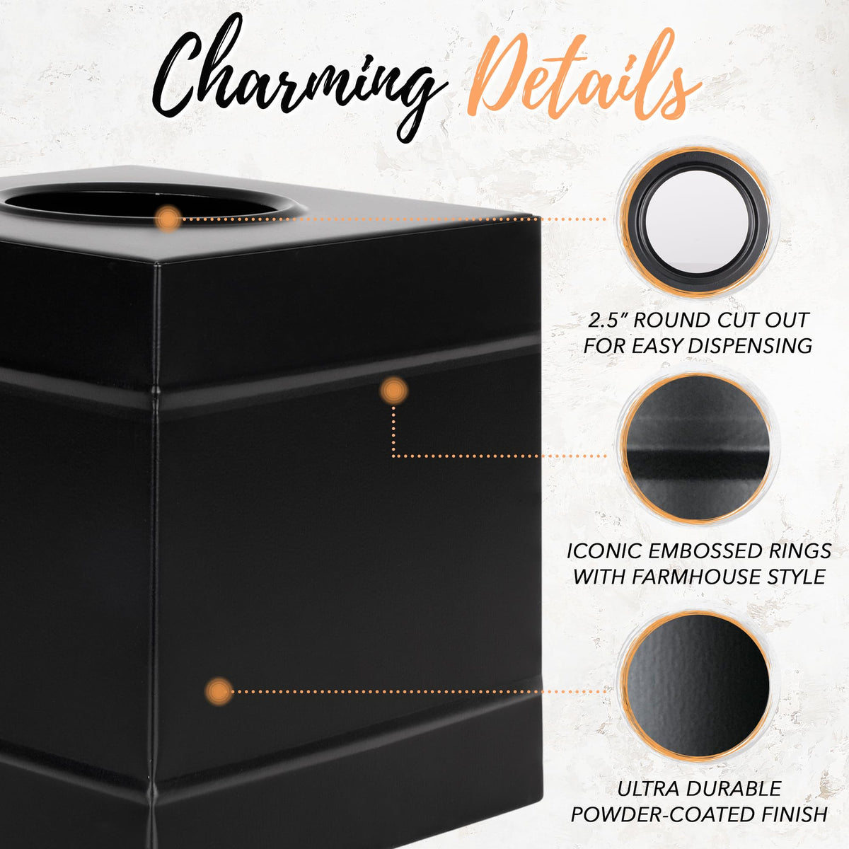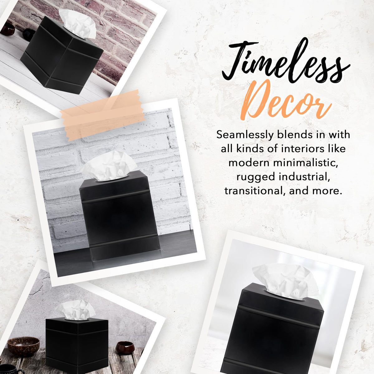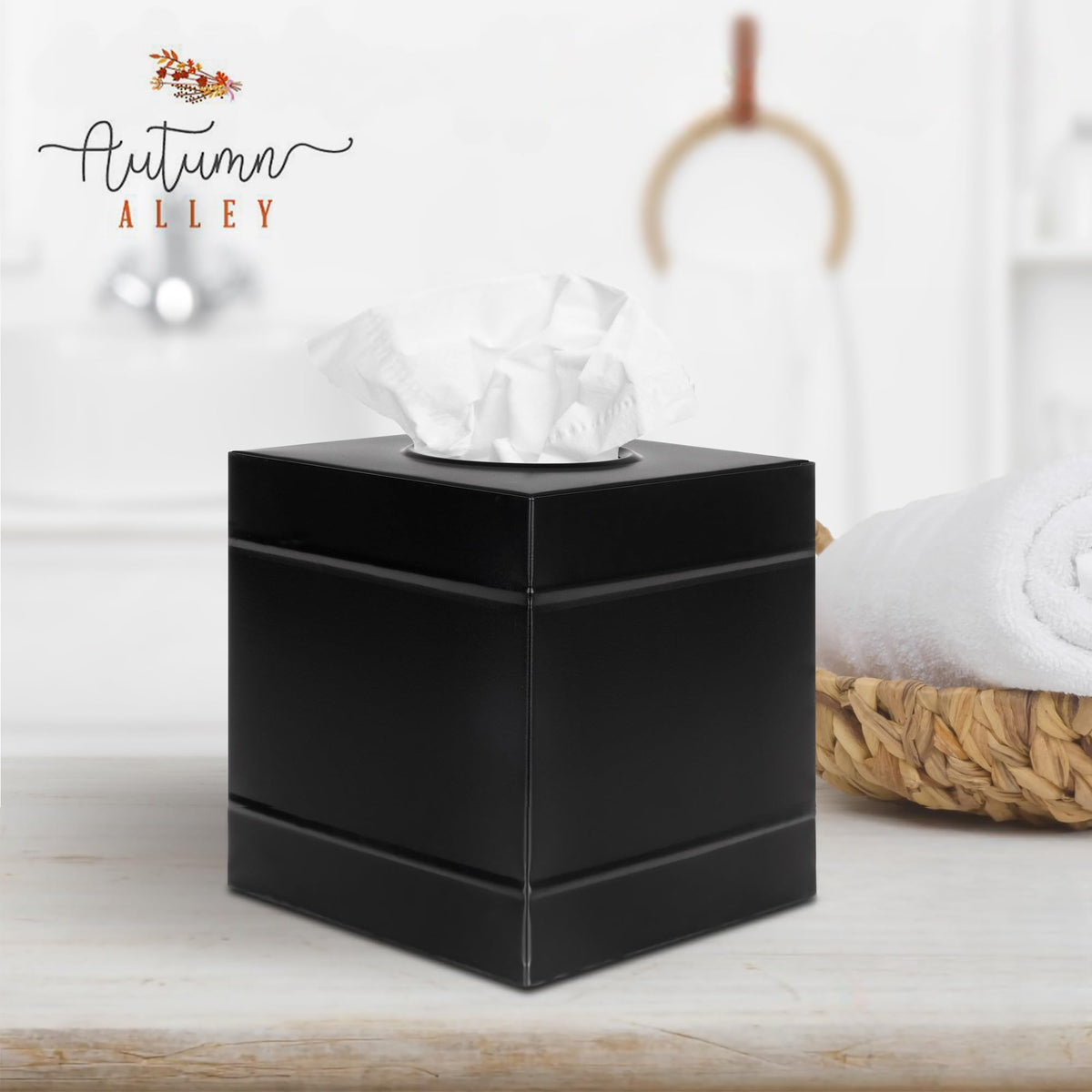 Q: What styles does the Autumn Alley tissue box cover complement?A: This tissue box cover features a classic matte black finish and embossed rings, making it a versatile addition that complements various styles, including modern minimalistic, rustic farmhouse, and industrial décor.