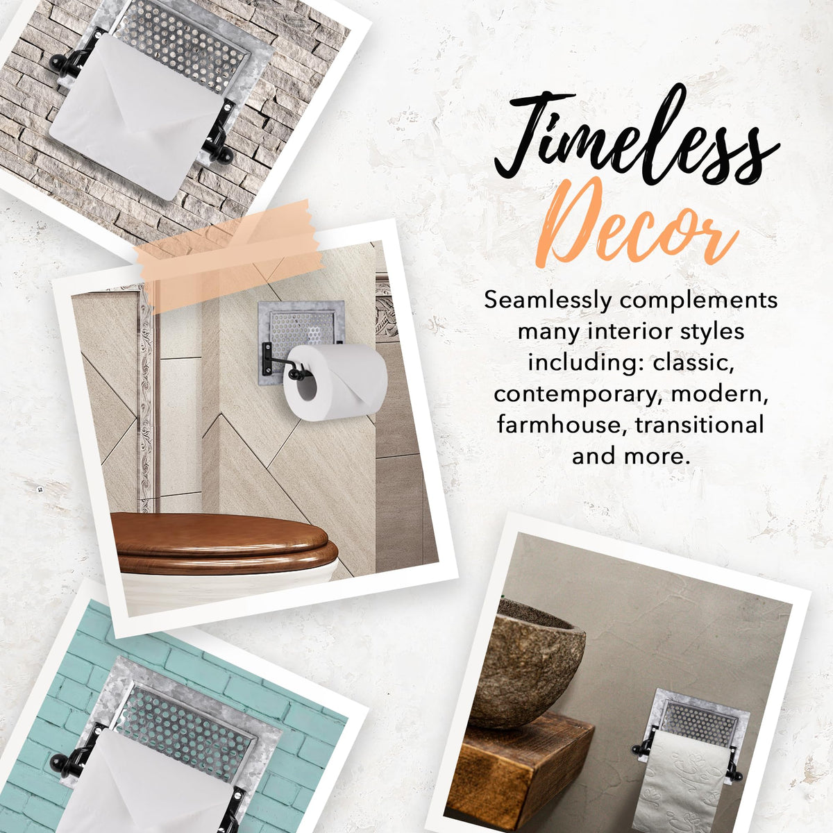 Q: Is the design of this holder suitable for all bathroom styles?A: Absolutely! The industrial farmhouse design of this toilet paper holder adds rustic charm and complements a variety of bathroom decors, especially when paired with other galvanized accessories.