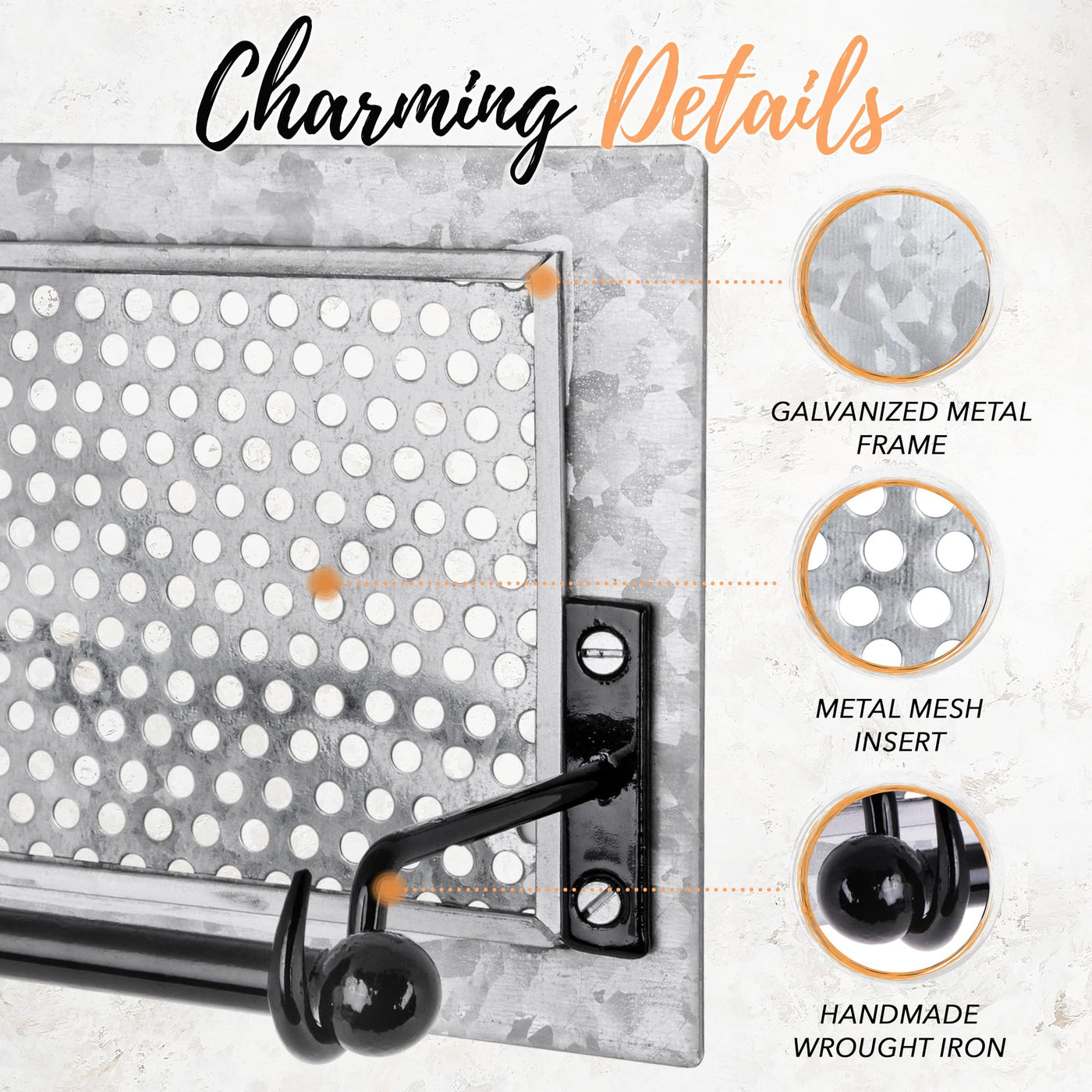 Q: What materials are used in the Autumn Alley Rustic Farmhouse Toilet Paper Holder?A: The holder is made from durable galvanized metal with black hooks and a perforated metal inset, combining strength with a stylish farmhouse aesthetic.