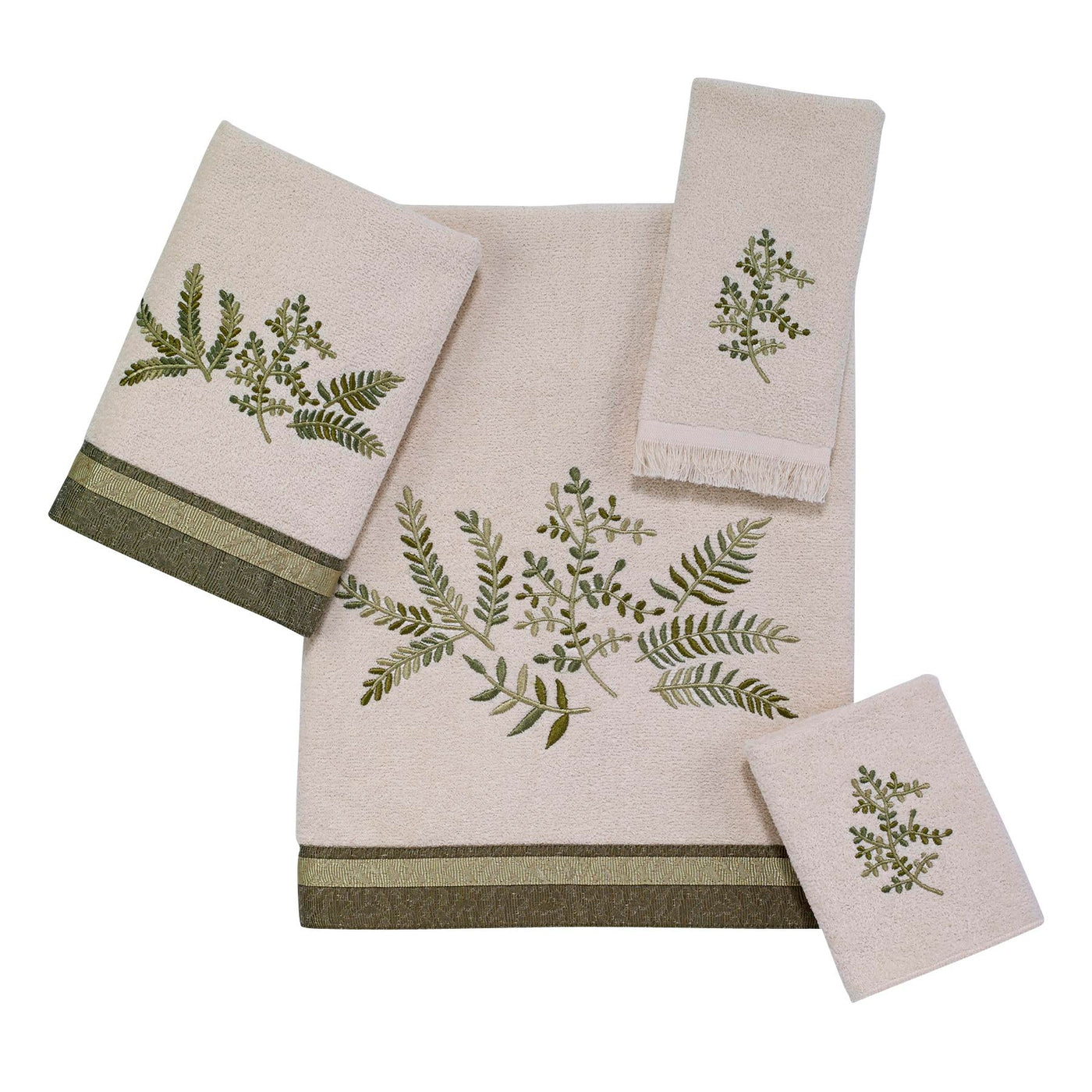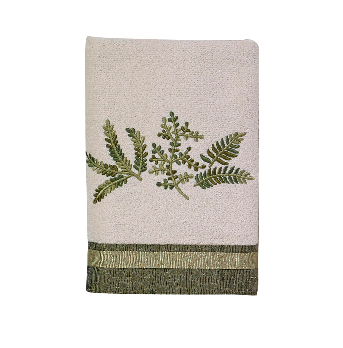 The Avanti Greenwood Ivory Decorative Towels Feature A Botanical Motif In Multiple Shades Of Green With A Coordinating Two-Tone Fabric Border On The Bath And Hand Sizes.