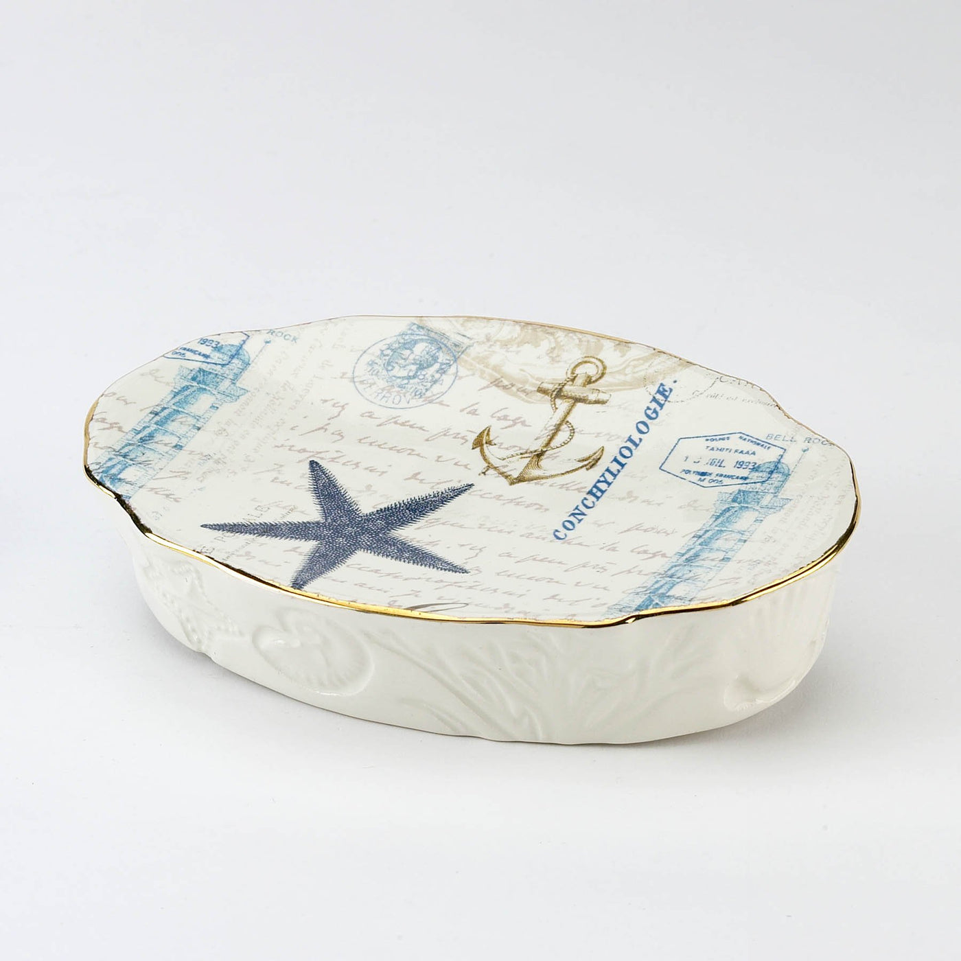 The Antigua Collection Soap Dish Is Decorated With A Beautifully Detailed Seascape Decal And Embossed With Sea Creatures In An Ivory Body With Gold Border