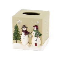 The Avanti Home Snowmen Gathering Tissue Box Cover Features 2 Snowmen In Plaid Scarves And Hunting Caps Meeting During A Snow Storm. They Have A Pile Of Snowballs And Pine Trees For Cover. Constructed Of Food-Safe Resin For Durability And Easy Care. Avanti Home. Making Your Home Beautiful Since 1969.