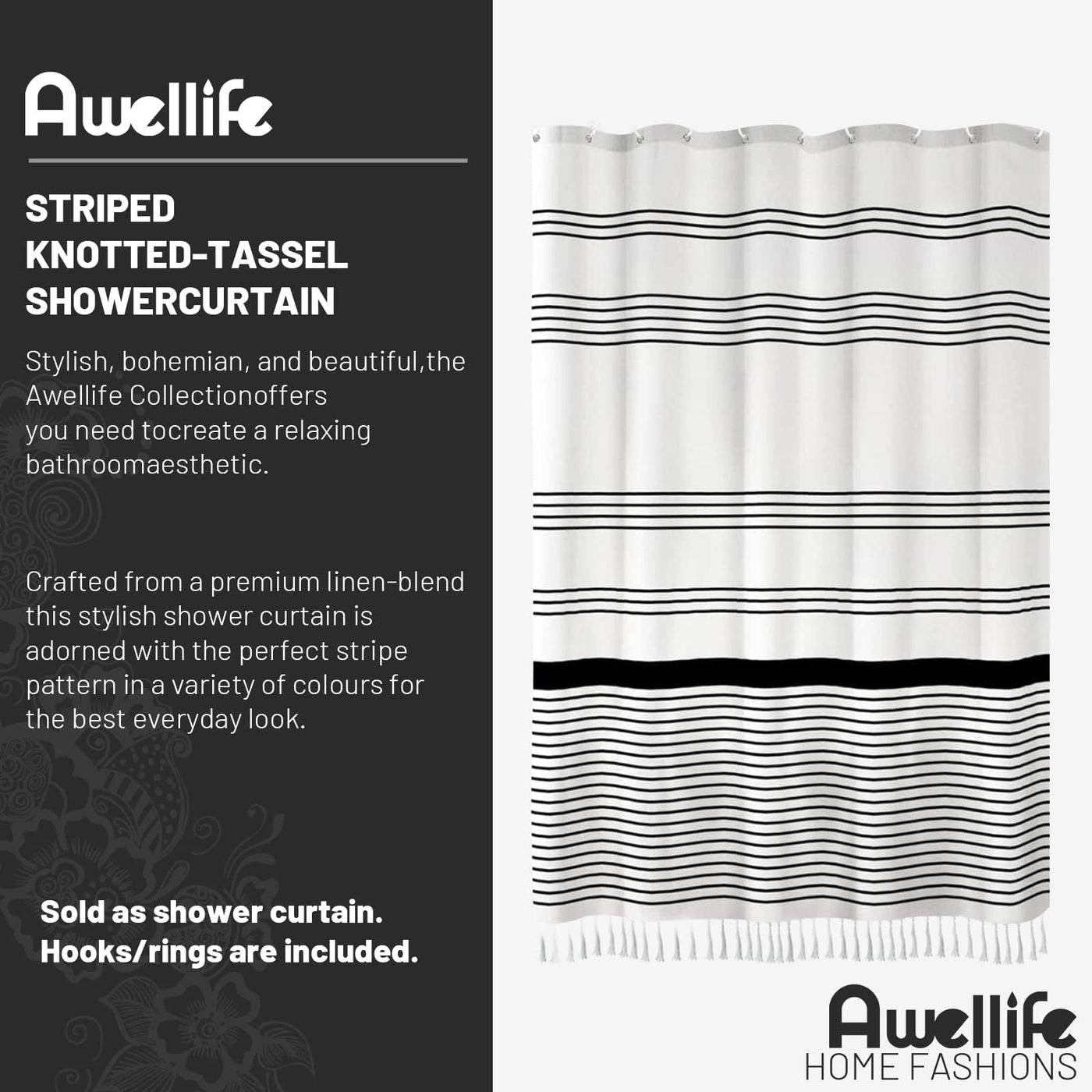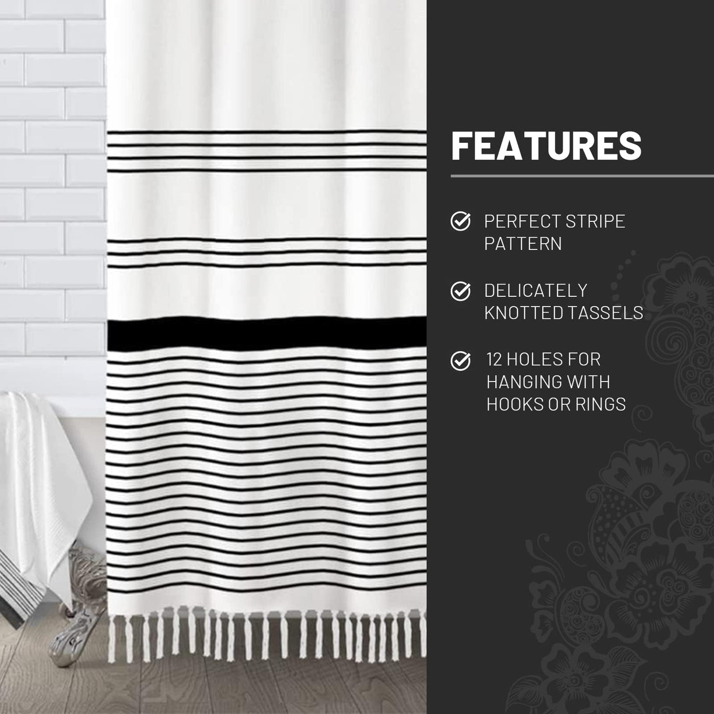 Awellife Boho Black Shower Curtain For Bathroom Farmhouse Natural Linen Stripe Tassel Shower Curtain (Black 1A, 72' L X 60' W)
