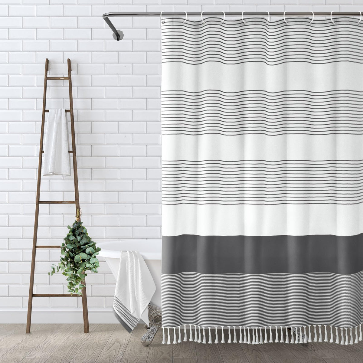 Awellife Gray Shower Curtain For Bathroom Stripe Tassel Shower Curtain 72 X 96 Farmhouse Linen Boho Dark Grey