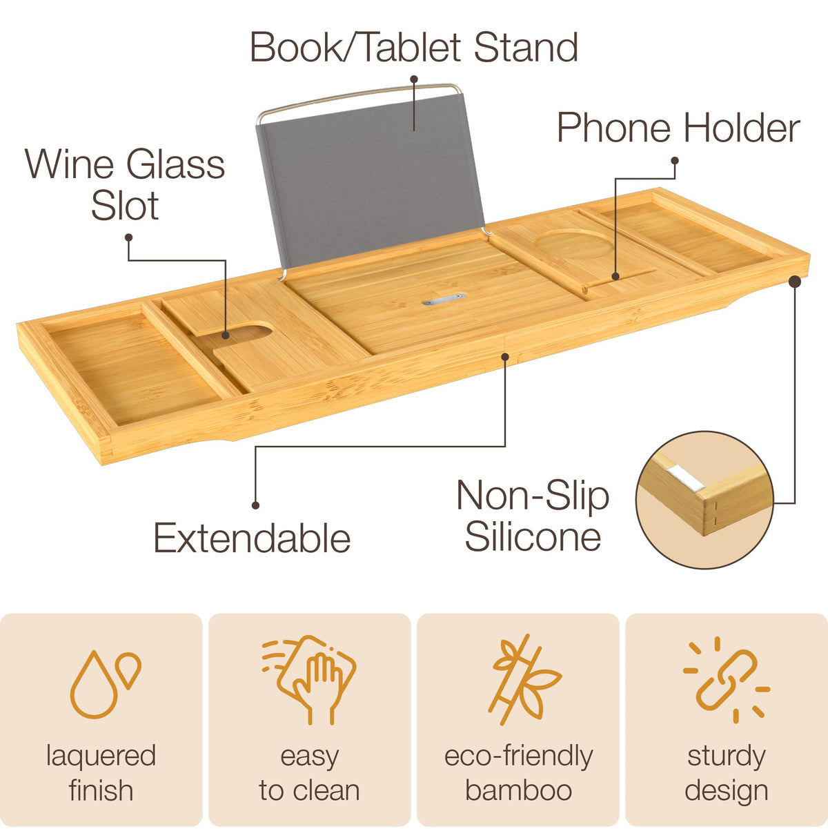 Bathtub Beauties: Relax And Read In Style!Your Soothing Bath Time Ritual Keeps Getting Better With Bambsi. Our New Bamboo Bath Caddy Provides Safer, Sturdier Convenience As You Unwind And Browse Your Favorite Reading Material In Water-Safe Fashion. This Fully Adjustable Book Holder Expands Over Your Tub Like A Bridge, Providing A Secure Shelf To House Your Favorite Novel Or Smart Tablet. For Added Security And No-Frills Soaking, Our Updated Caddy Incorporates Additional Features Including An Advanced 5-Notch Adjustable Rack With A Tighter Fit, A Soft Cloth Cover Overlay, A Reliable Wine Holder And A Deeper Concave Phone Tray. Display It Proudly With Your Existing D Cor, And Enjoy Peace Of Mind During Every Splashy, Sudsy Dip. Its The Spa Organizer That Delivers A Dry, Tranquil Reading Experience Every Single Time.Superior Water Protectionsafeguard Your Books, Tablets And Other Gadgets With The Caddys Rustproof Metal Reading Rack. A Special Water-Resistant Cloth Adds Extra Defense, Ensuring Nothing Falls Through Its Sturdy Support And Reliable Grip.Greater Reading Versatilityour Updated Design Features A Tighter, More Secure 5-Notch Adjustable Rack, Helping You Comfortably Browse A Variety Of Small And Large Ipads, Tablets Or 3.10.17 Books. Safely Achieve Your Ideal Position And Angle Without Worrying About Slips Or Splashes.Specs & Detailsmeasures 27 5/8 [Closed]; 41 [Extended]Phone Tray: 6 H X 3 W X Dwaterproof Metal Rack100% Bamboo Basehow To Enjoyextend Your Bathtub Tray Across The Bubbly Thresholdneatly Organize Your Choice Of Drink And Accessoriesrelax, Unwind And Revel In Your Reading Pleasurewhen Youre Done, Fold Down The Rack, Slide In The Legs And Store