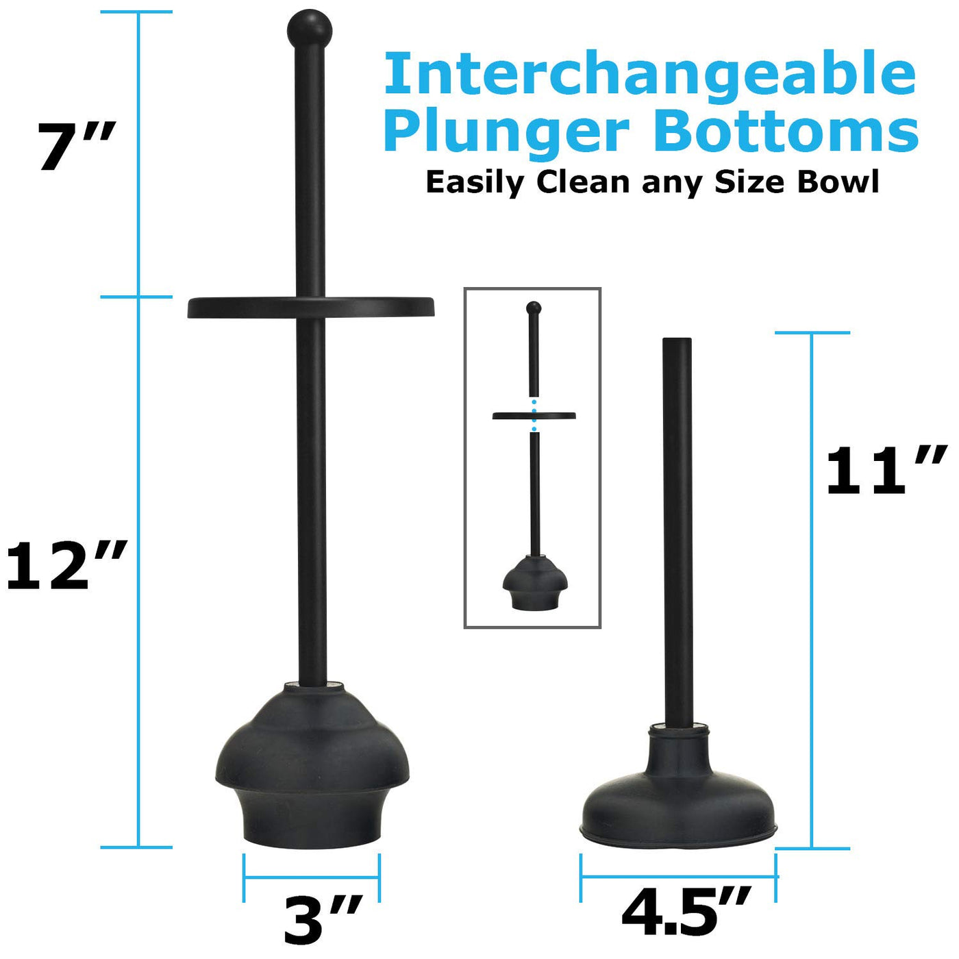 Q: What is included in the Blue Donuts Toilet Brush and Plunger Set?A: The set includes a modern toilet brush and a heavy-duty toilet plunger, both designed with a stylish holder. It features interchangeable rubber plunger heads and brushes for efficient cleaning.