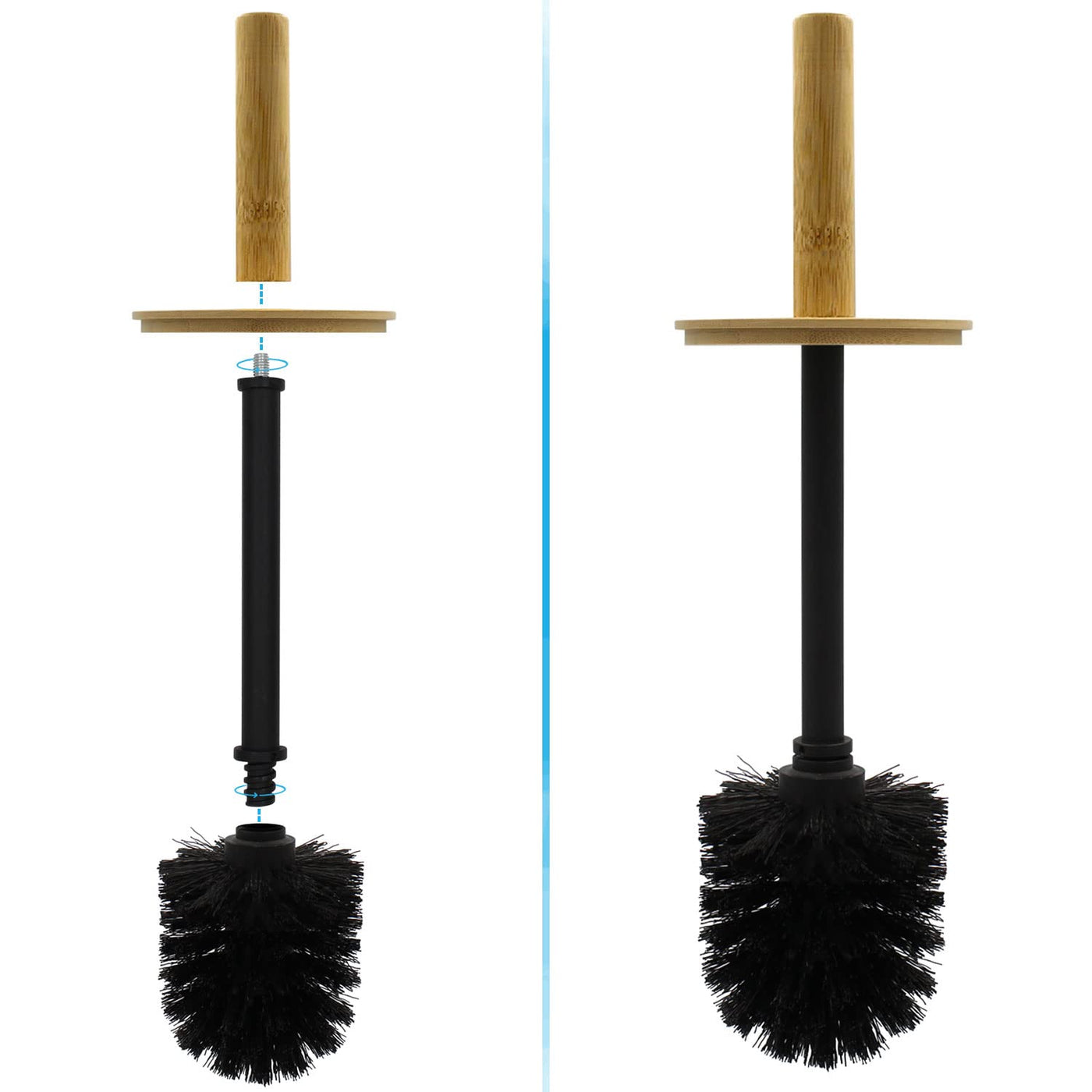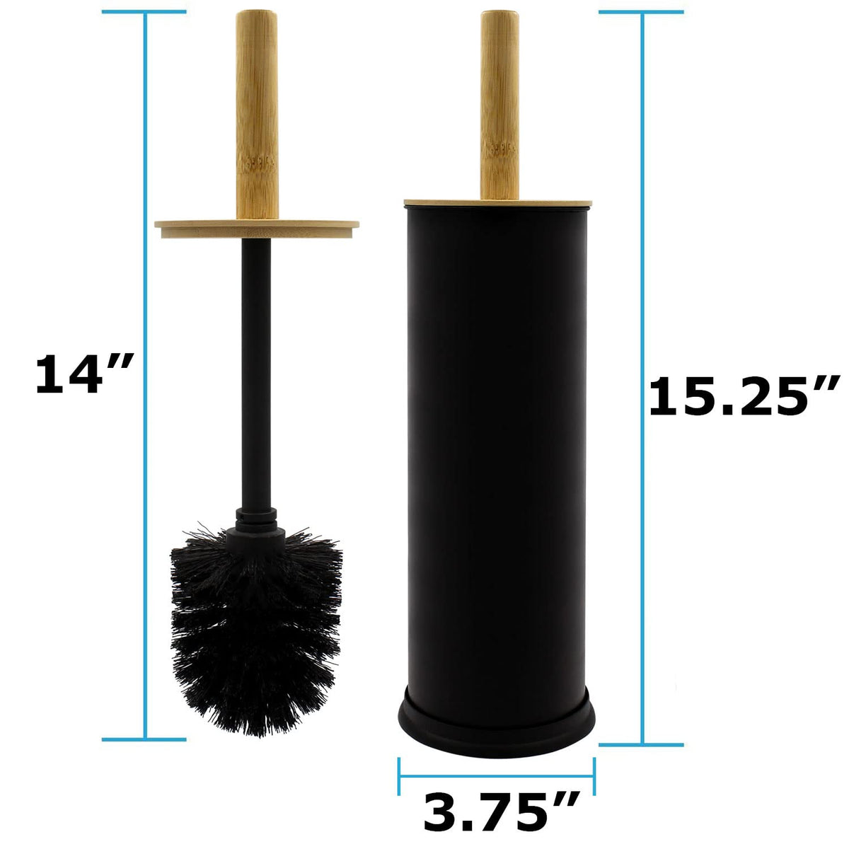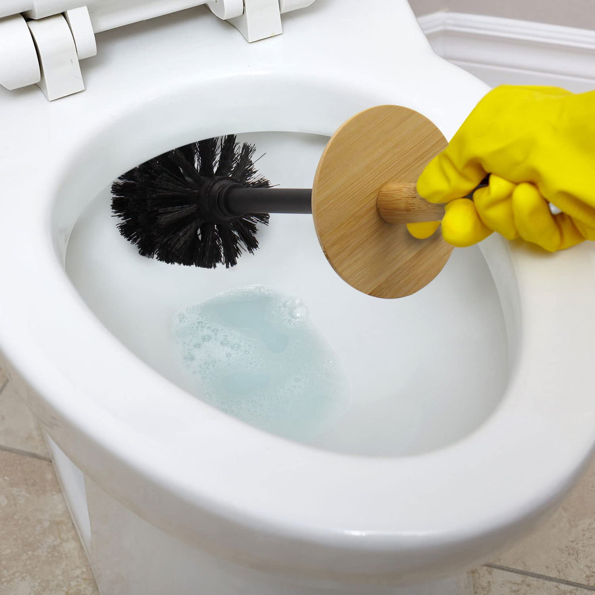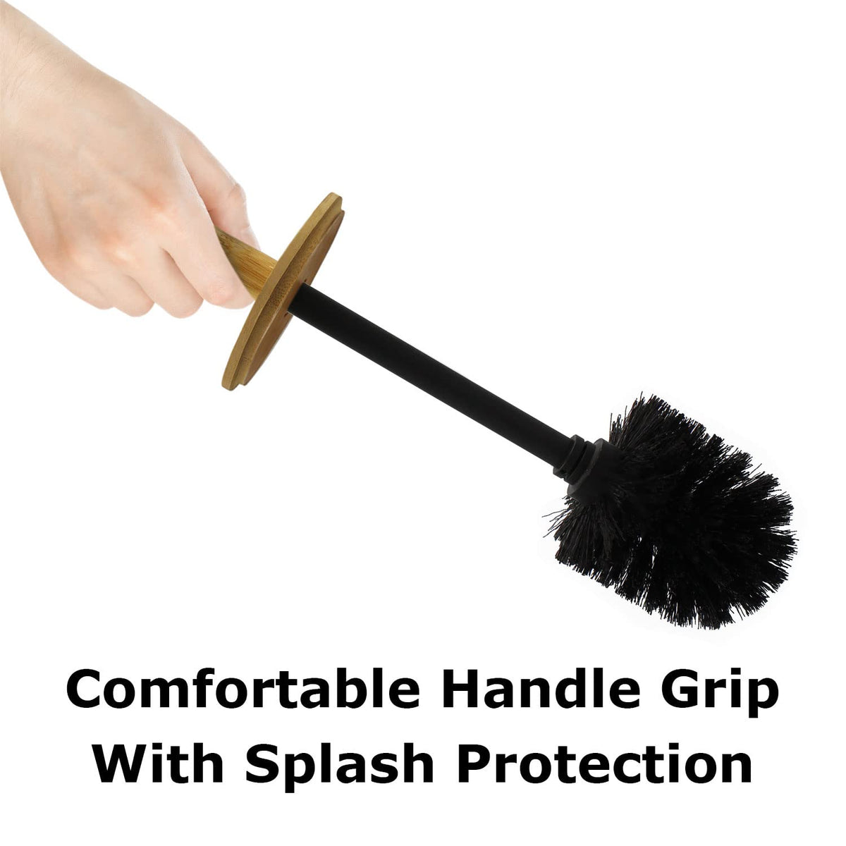 Q: How does the bamboo handle benefit the toilet brush holder?A: The bamboo handle offers a stylish and eco-friendly touch while providing a sturdy grip for effective cleaning. It also comes with a splash guard to help keep your bathroom clean.