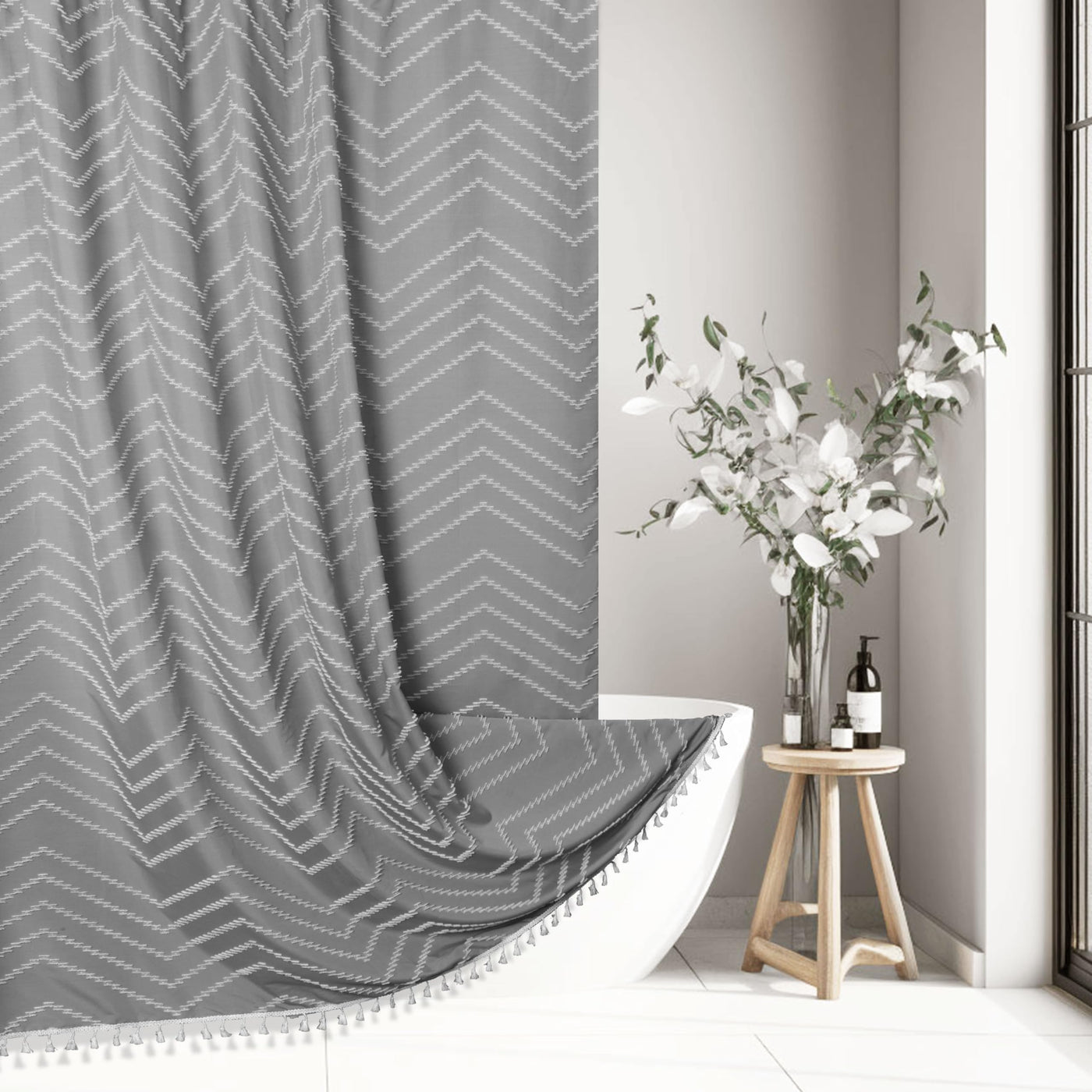 Boho Shower Curtain With Tassel Woven Fabric Grey Shower Curtain 72 X 72 Modern Farmhouse Textured Tufted Chevron Striped Minima