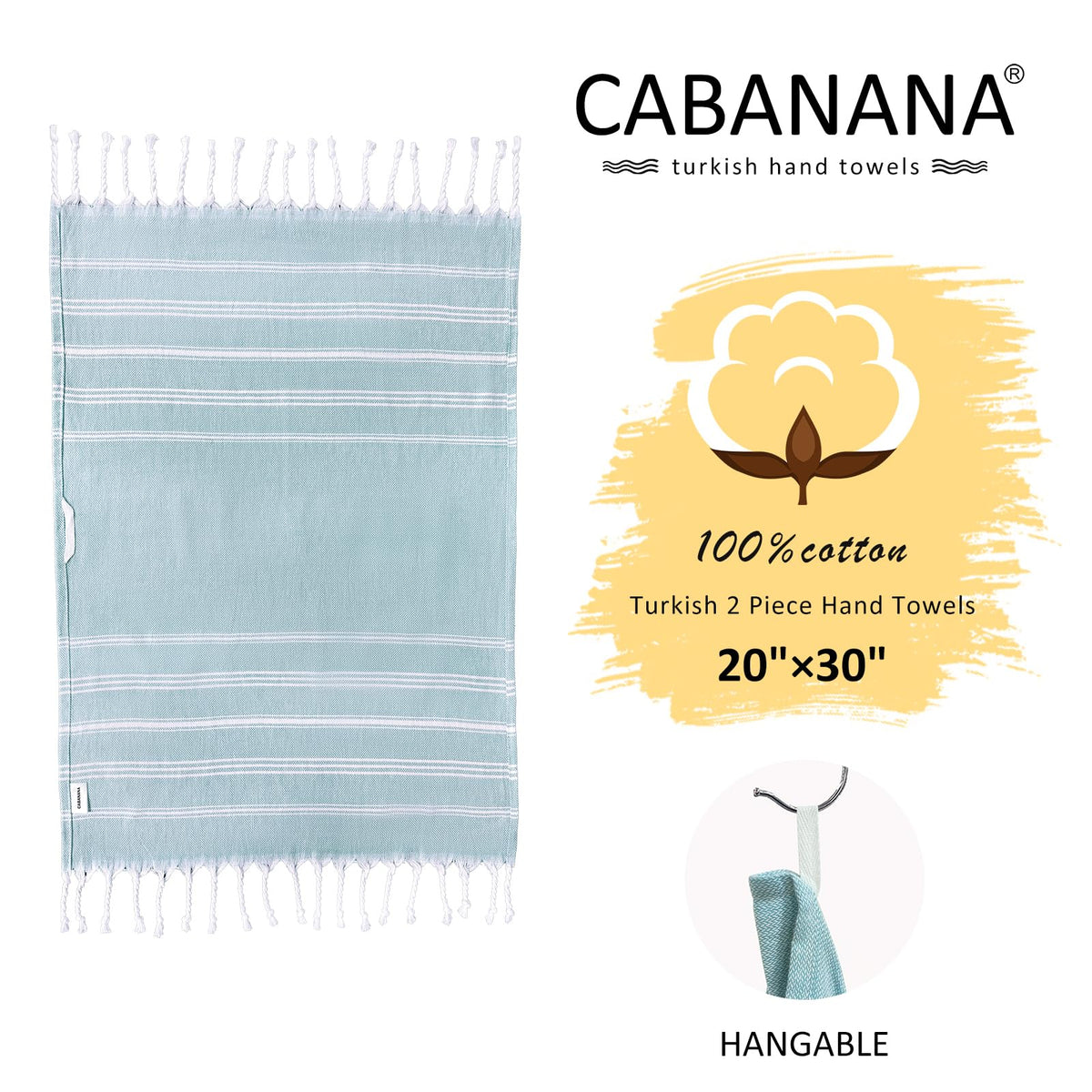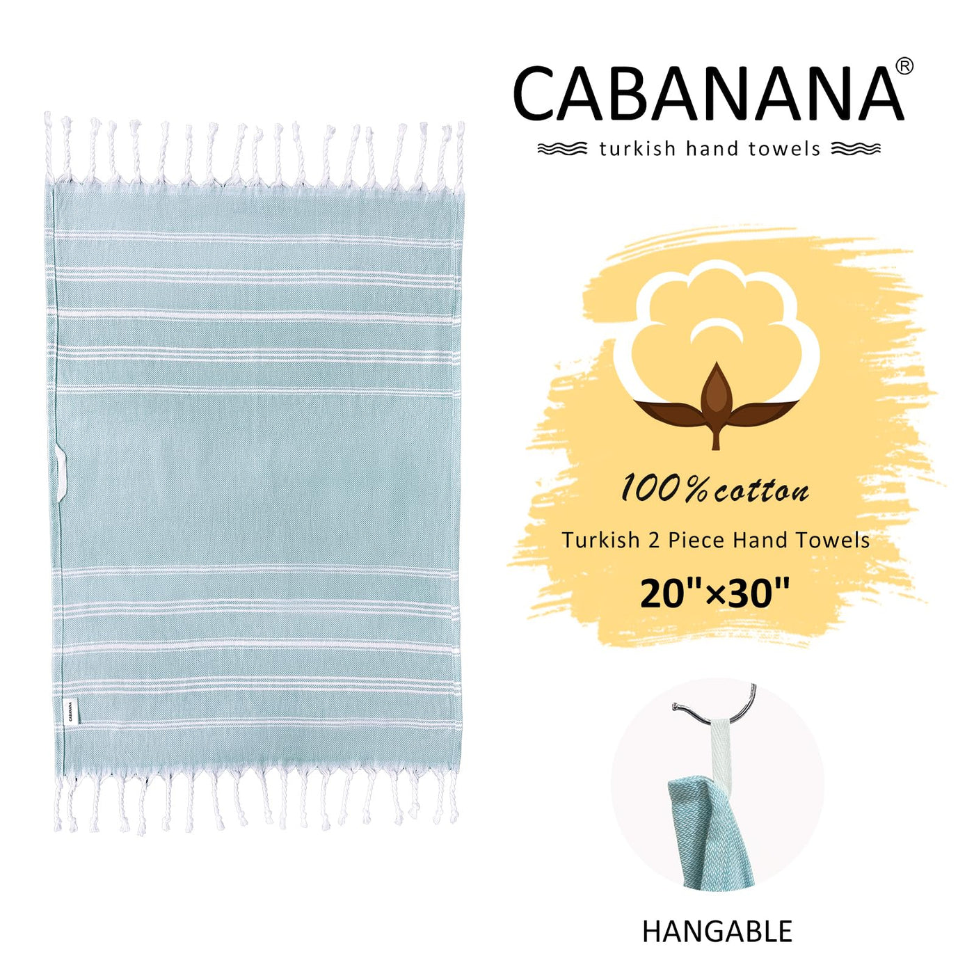 Features Of Cabanana Turkish Hand Towel ? 100% Natural Cotton ? Highly Absorbable And Quick Dry ? Decorative And Stylish ? Takes Up Very Little Space ? Fashionable And Eco Friendly ? Easy To Pack And Carry ? Gets Softer After Each Wash Where To Use ? Bathroom ? Travel ? House Decoration ? Kitchen ? In Daily Life, Such As: Face Towel, Hand Towel, Guest Towel, Gym Towel, Hair Towel, Dish Towel, Tea Towel. Care Instructions - Machine Wash 85-90F (30C). - Do Not Use Fabric Softener And Do Not Bleach - Do Not Tumble Dry. Air Dry Is The Best Option. - Use A Warm Iron To Smooth Out Any Unwanted Wrinkles. Weight 120G/Pcs, 4Oz/Pcs Size 30 X 20 Inch, 76 X 51Cm Package 2 Turkish Hand Towels In Pack