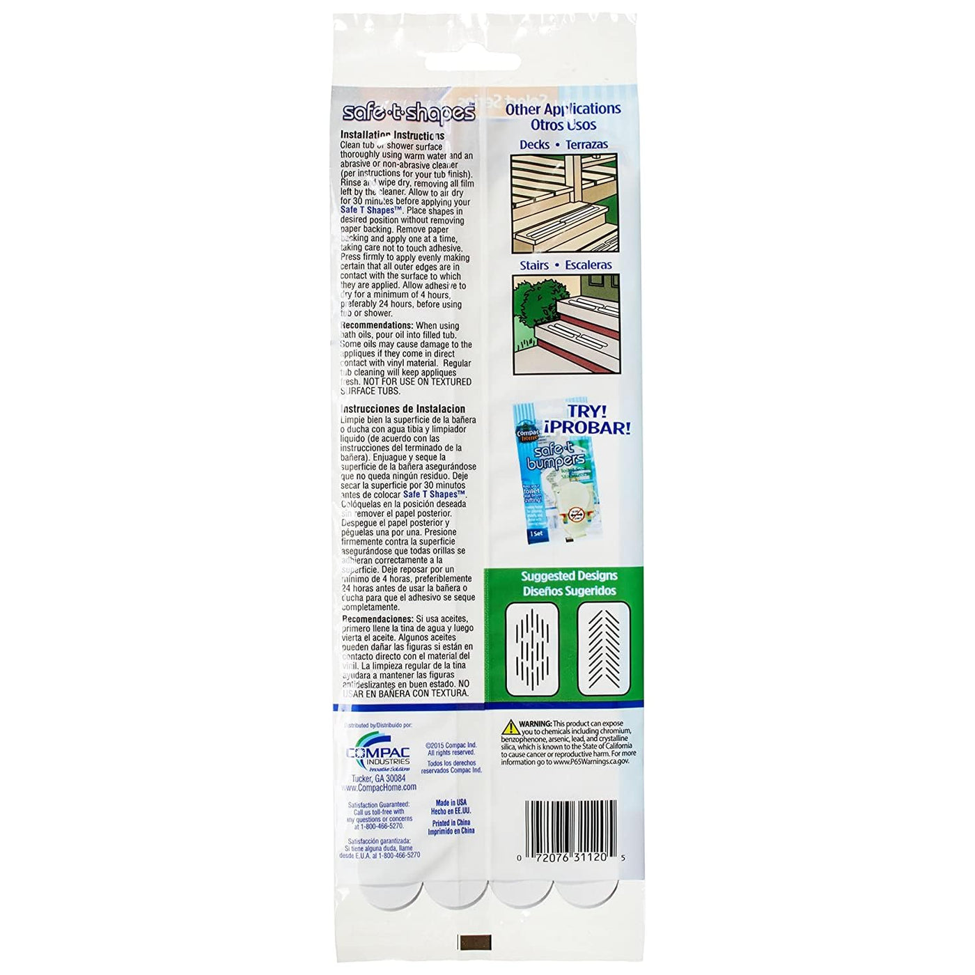 Compacs Safe-T-Strips Are Anti Slip Shower Stickers, Strips That Keep You And Your Family, Friends, And Even Pets, Safe From Slipping In The Tub Or Shower Or Other Slippery Surfaces, Like Stairs And Decks. Easy To Apply And Fun To Arrange, Just Remove The Adhesive Backing, Place Them On A Clean Surface, And Press Firmly. Safe T Shapes Have A Textured Surface That Keeps Your Feet Secure And Slip-Free. Application Is Permanent, Meaning They Wont Wear Off With Use Or Peel Away, And The Safe-T-Strips Can Provide The Stability You Need On Many Kinds Of Slick Surfaces. May Also Be Used On Decks, Stairs, Spas, Or Hot Tubs.Safe-T-Strips Are Perfect For Your Tub Or Shower; However, Theyre Not For Use On Already Textured Surfaces. Cleaning Your Tub Or Shower As Usual Will Help Keep Safe-T-Strips Fresh And Looking Good; No Special Cleaning Practices Are Required. When Using Bath Oils, Pour Oil Into A Filled Tub, Because Direct Contact With Oil Can Damage The Shapes.