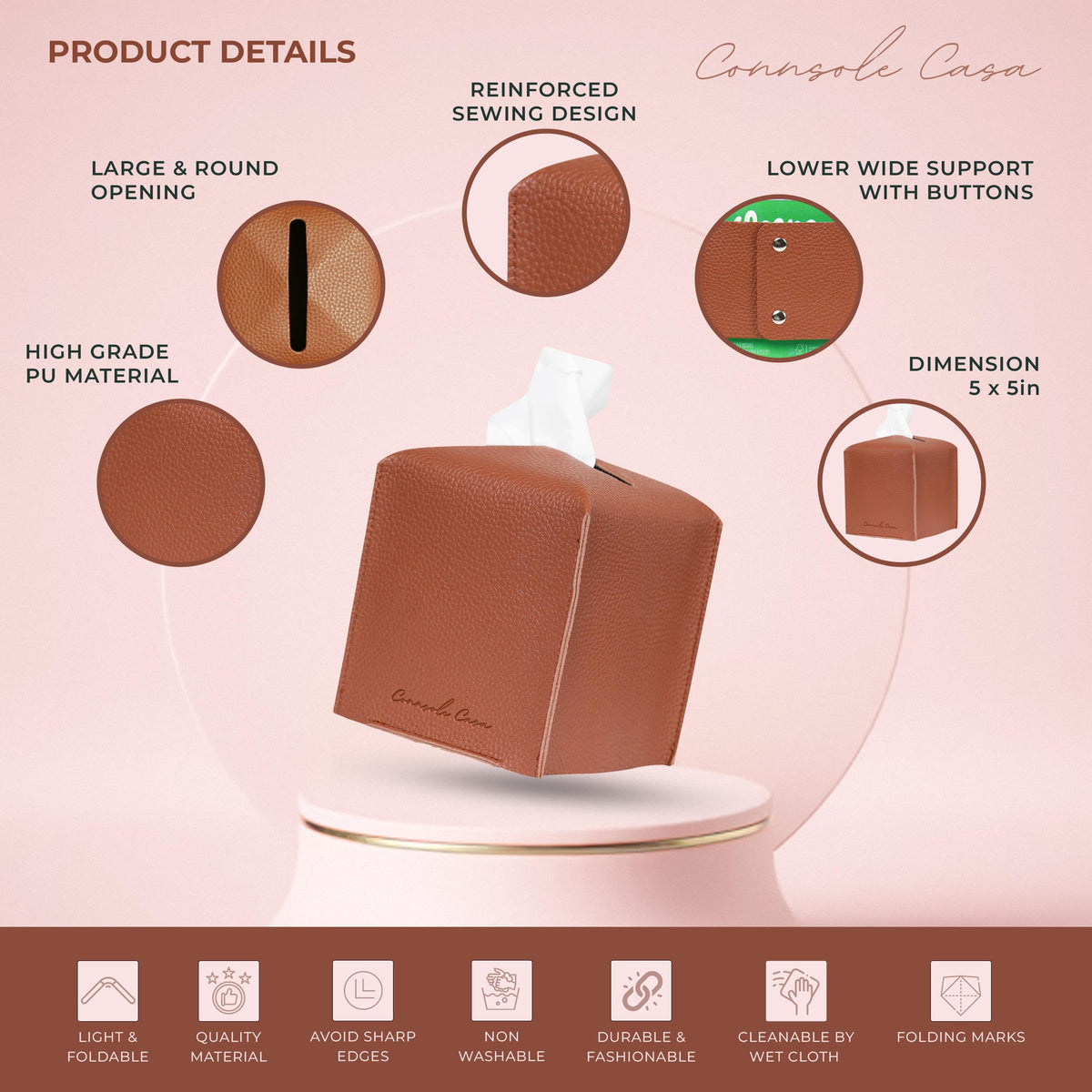 Transform Your Tissue Box Experience With The Connsole Casa Leather Tissue Box Holder. This Stylish And Durable Tissue Box Holder Is The Perfect Accessory For Any Home, Office, Or Car. Made From High-Quality Pu Leather, It Ensures That Your Kleenex Box Stays Secure While Adding A Touch Of Elegance To Your Space. The Tissue Box Cover Is Designed To Fit Most Standard Kleenex Tissues Cube Sizes, Making It A Versatile Choice For Any Setting. Our Tissue Box Offers Easy Refilling With A Convenient Bottom Snap Support, Ensuring Your Tissues Box Remains Neat And Organized. The Sleek Design Of The Kleenex Cube Makes It A Stylish Addition To Any Room, Enhancing Your Decor With Its Modern Aesthetic. Whether You Use It As A Tissue Box Holder Or A Decorative Piece, This Tissue Box Cover Is Designed To Meet Your Needs And Withstand Daily Use. Perfect For Cars, Our Tissue Box Fits Snugly, Ensuring You Have Tissues Box On Hand Whenever You Need Them. It'S A Family-Friendly Solution That Keeps Your Tissue Cube Organized And Within Reach. Plus, It Makes A Great Gift Idea, Adding A Practical And Stylish Touch To Any Home Or Office. Upgrade Your Tissue Box Experience With The Connsole Casa Leather Tissue Box Holder And Enjoy The Convenience And Elegance It Brings To Your Space.