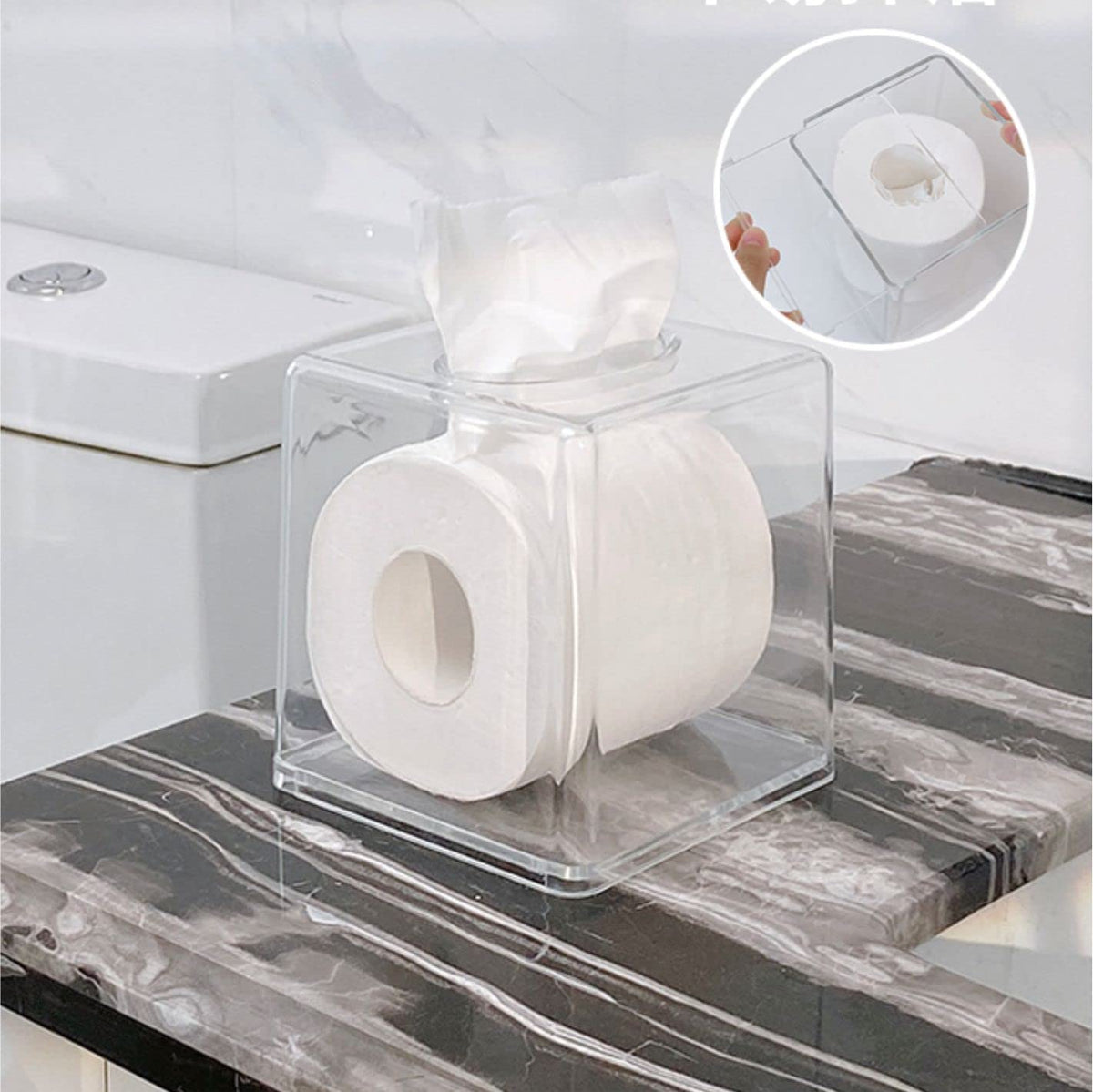 Q: What are the dimensions of the Cq acrylic Roll Tissue Box Holder?A: The Cq acrylic Roll Tissue Box Holder measures 5.5 inches in length, 5.5 inches in width, and 5.5 inches in height, making it suitable for most standard-sized tissue boxes.