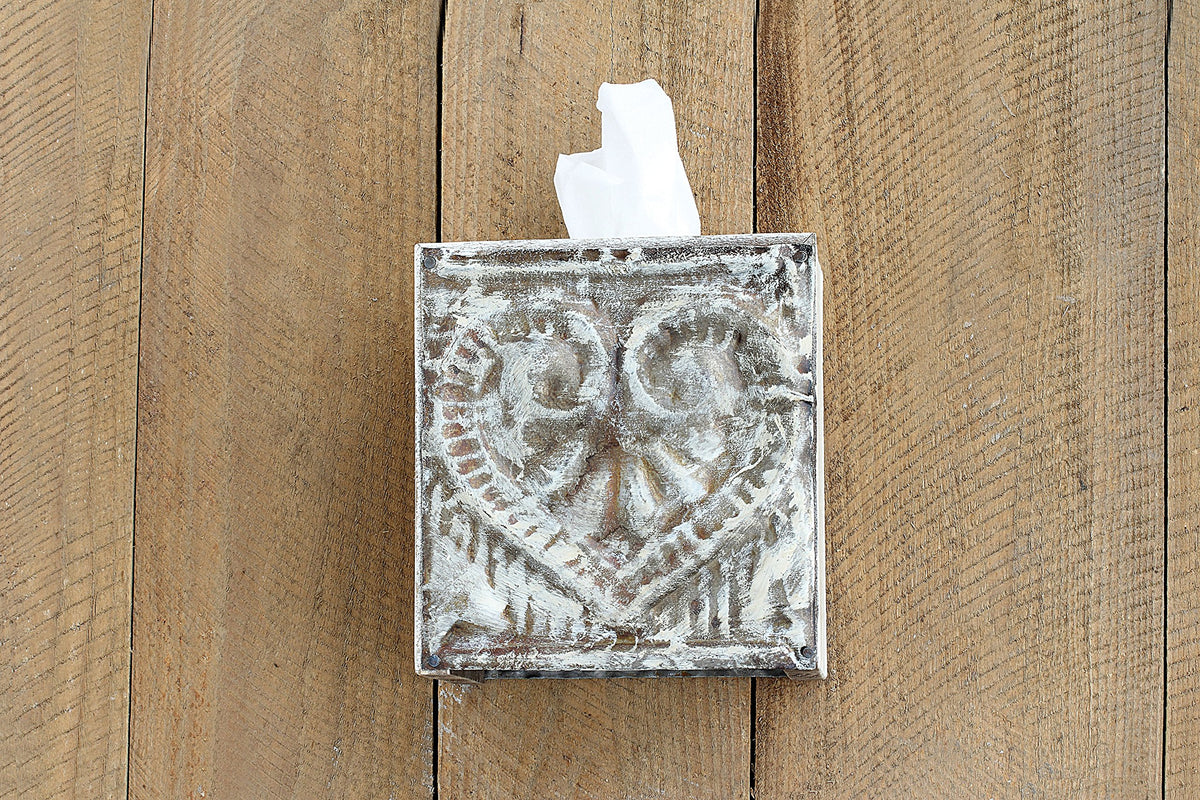 Q: What materials are used in the Creative Co-Op Bless You Tissue Box Cover?A: The Creative Co-Op Bless You Tissue Box Cover is constructed from a combination of wood and tin, providing a unique and stylish design.