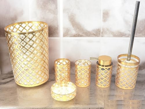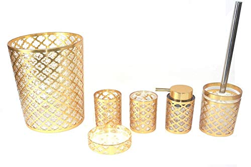 Q: Is this bathroom accessory set compatible with all bathroom designs?A: Yes, the gold color and sleek design of the accessory set make it easy to match with any bathroom color and style.