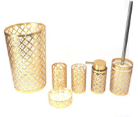 Q: What are the dimensions of the items in the set?A: The set includes: Trash Can (10.5'' H x 8'' W x 8'' D), Pump (3'' H x 3'' W), Toilet Brush Holder (5.5'' H x 4'' W x 4'' D), Soap Dish (1.25'' H x 4.25'' W x 4.25'' D), Toothbrush Holder (4'' H x 3'' W x 3'' D), and Tumbler (4'' H x 3'' W).