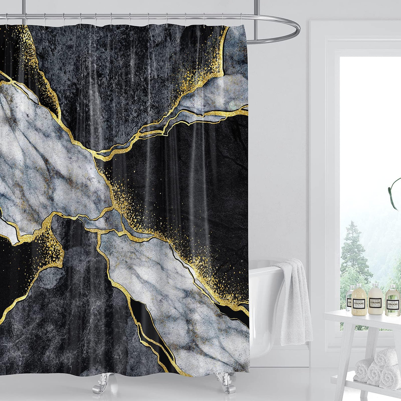 Q: What materials are used in the Domoku Black Gold Marble Shower Curtain?A: The Domoku Black Gold Marble Shower Curtain is made from high-quality waterproof polyester fabric that has been specially treated to provide outstanding waterproof performance while being eco-friendly and durable.