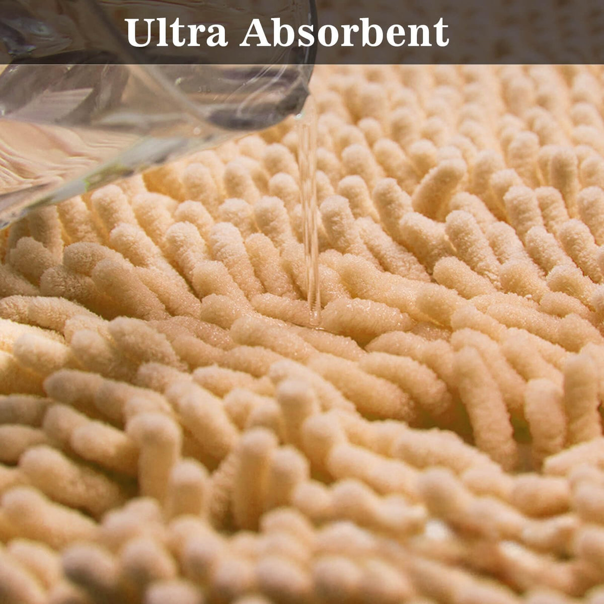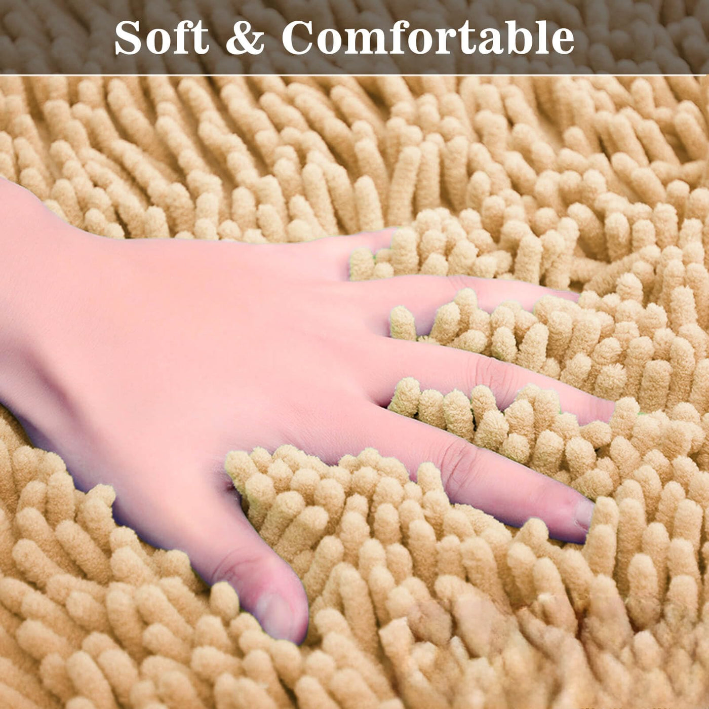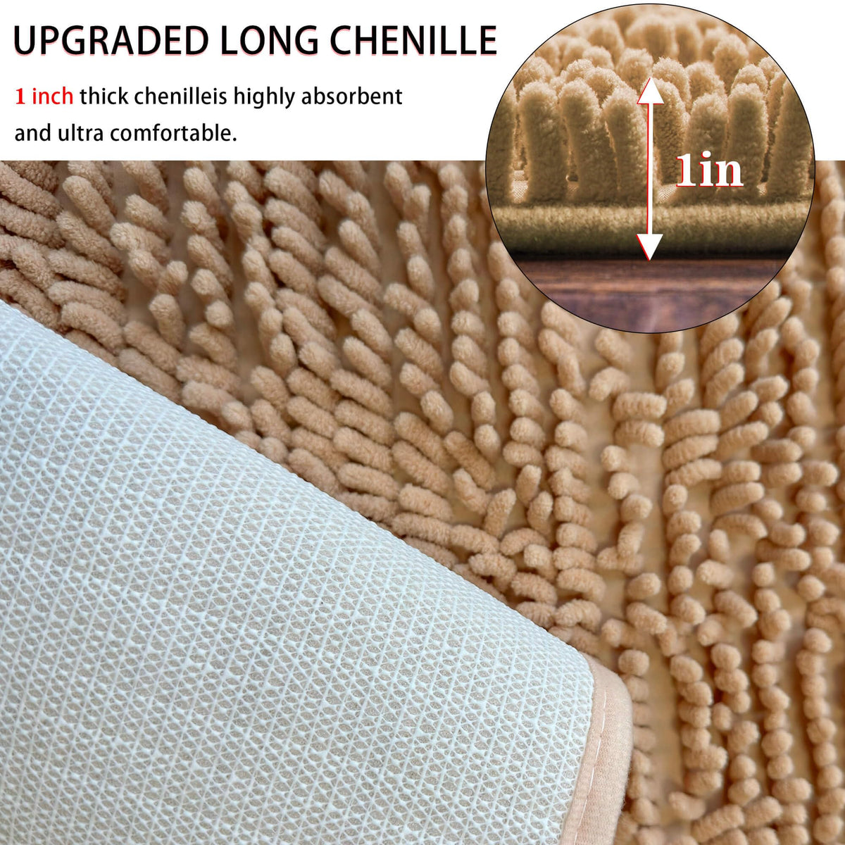 Q: What materials are used in this bath mat?A: The bath mat is crafted from high-quality chenille fabric microfiber, providing a soft and luxurious feel underfoot.