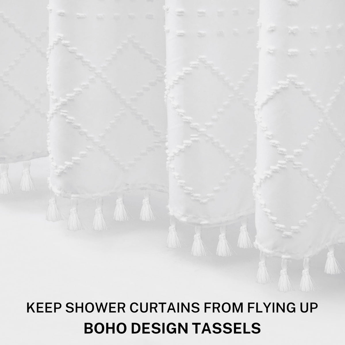 Extra Long Boho White Woven Fabric Shower Curtain With Tassels 54 X 78 Modern Farmhouse Minimalist, Tufted Chevron Striped Shabb