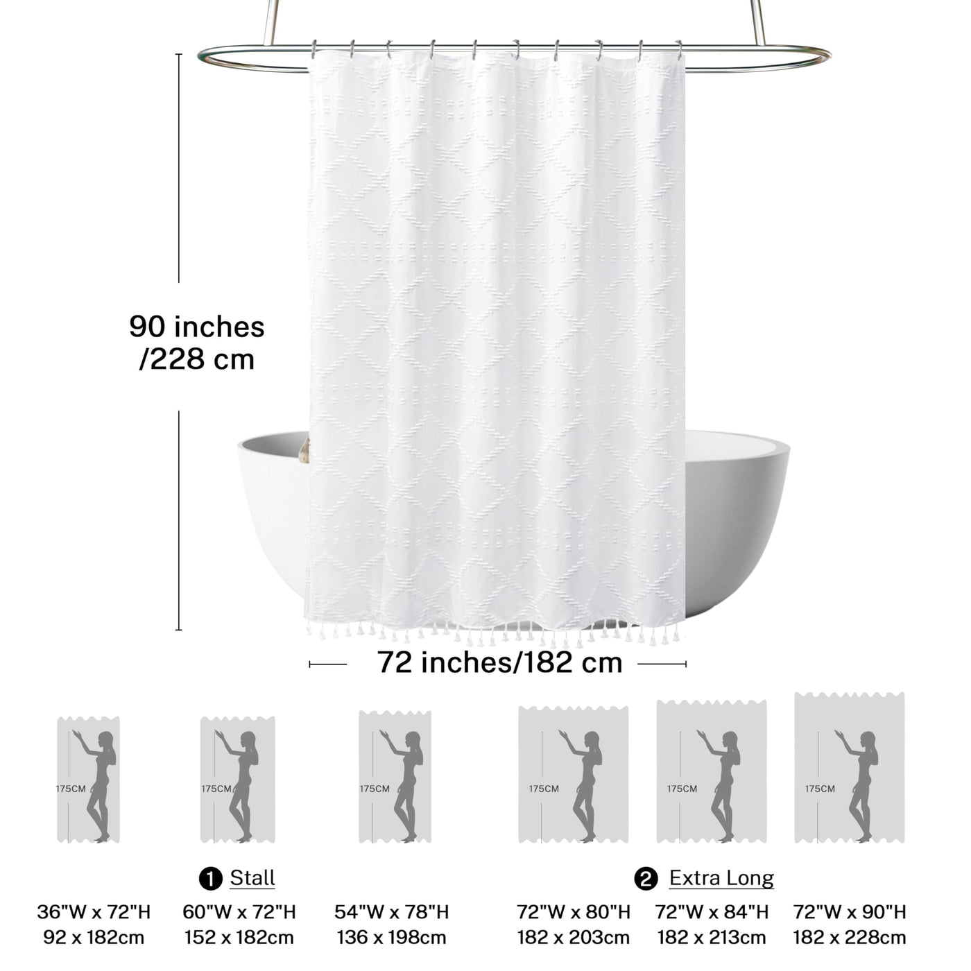 Extra Long White Textured Woven Fabric Boho Shower Curtain With Tassels 72 X 90 Modern Farmhouse Minimalist, Tufted Chevron Stri