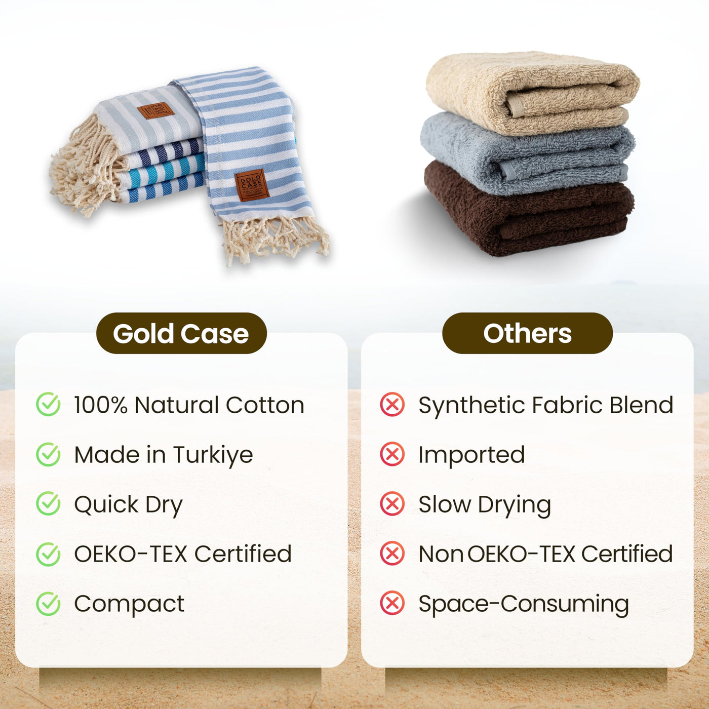 Q: How do these towels compare in size to traditional terry towels?A: The Gold CASE Turkish hand towels measure 20 x 40 inches, making them compact and convenient. Four of these towels occupy the same space as a traditional terry towel, which means you can enjoy the benefits of high-quality towels without compromising on storage space.