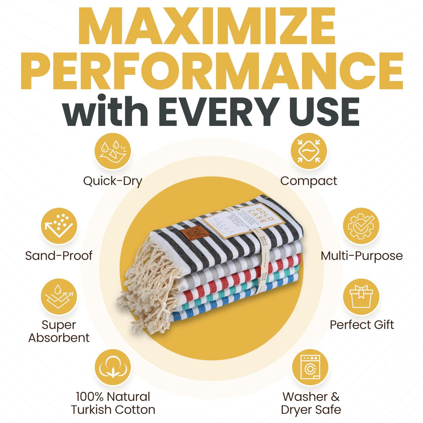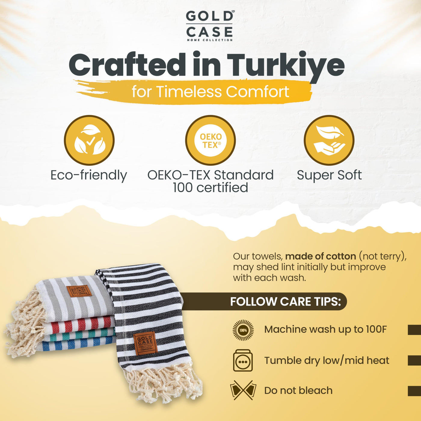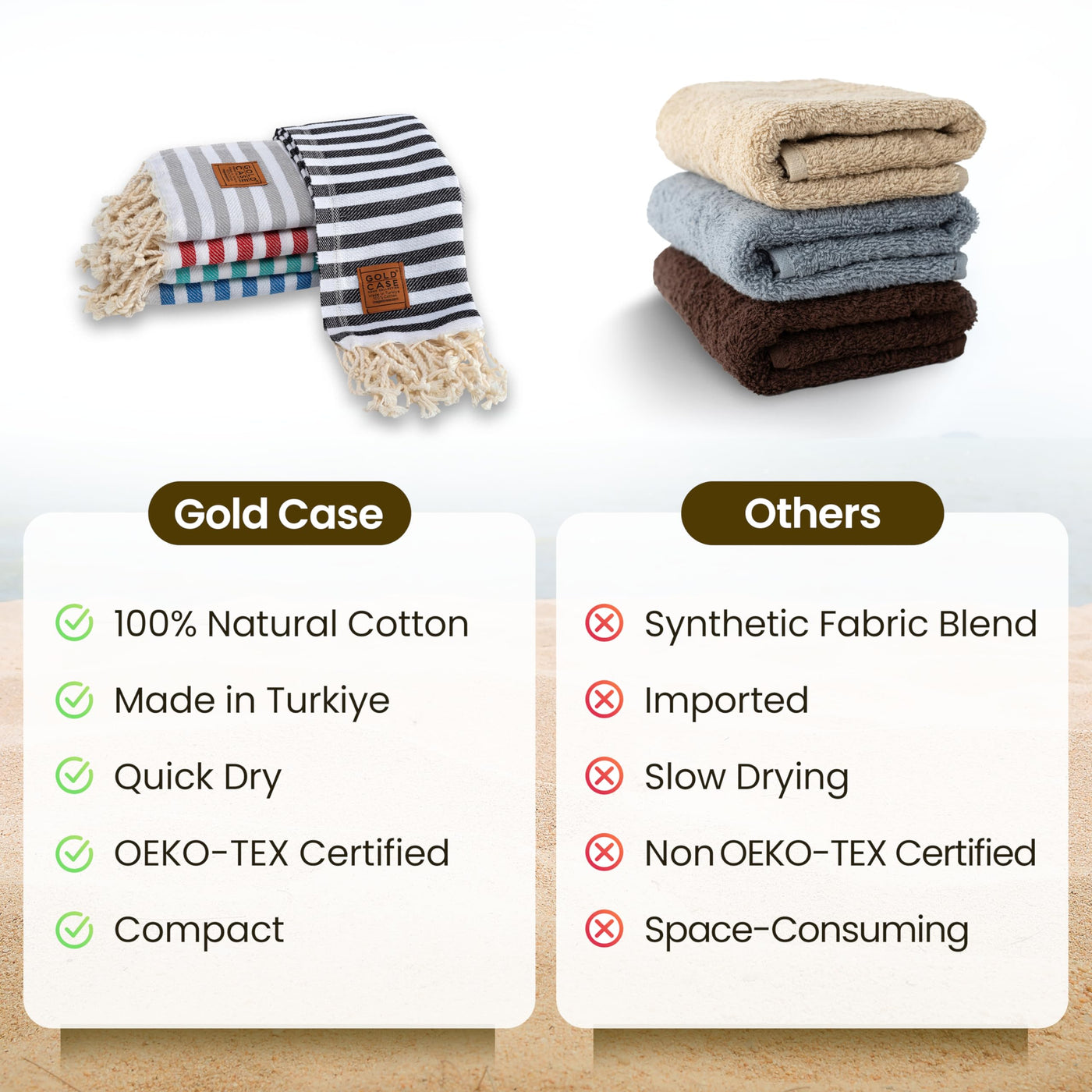 Embrace Pure Comfort: Crafted With Care From 100% Natural Cotton In Turkiye, Our Beach Essential Towels Offer A Soft And Plush Embrace Like No Other. Please Note, Due To The Natural Cotton Material, Some Parts May Leave Lint After Initial Washes As We Avoid The Use Of Bleach And Corrosive Chemicals. This Linting Diminishes Over Subsequent Washes, Following Our Care Instructions: Machine Wash Up To 100F Max, Tumble Dry Low/Mid Heat, And Do Not Bleach. Elevate Your Relaxation Game With The Myra Quick Dry Towel Set - Your Ticket To A World Of Coziness. Your Travel-Friendly Companions: Thin, Lightweight, And Generously Sized, These Gold Case Turkish Beach Towels Redefine Convenience For Your On-The-Go Lifestyle. Perfect For Travel, Camping, Or A Quick Yoga Session, They Take Up Minimal Space While Providing Maximum Comfort. Pack Light, Stay Bright, And Enjoy The Freedom Of Movement With These Versatile Travel Beach Towels. Join The Eco-Conscious Wave With The Myra Turkish Towel Set: Certified By Oeko-Tex Standard 100 And Made From 100% Turkish Cotton, Our Quick Dry Beach Towel Set Is Your Guilt-Free Indulgence. Embrace The Joy Of Using A Product That Not Only Cares For Your Comfort But Also Cares For The Environment. Wrap Yourself In Eco-Friendly Beach Travel Essentials And Make A Positive Choice With The Myra Original Sand Free Beach Towel Set.