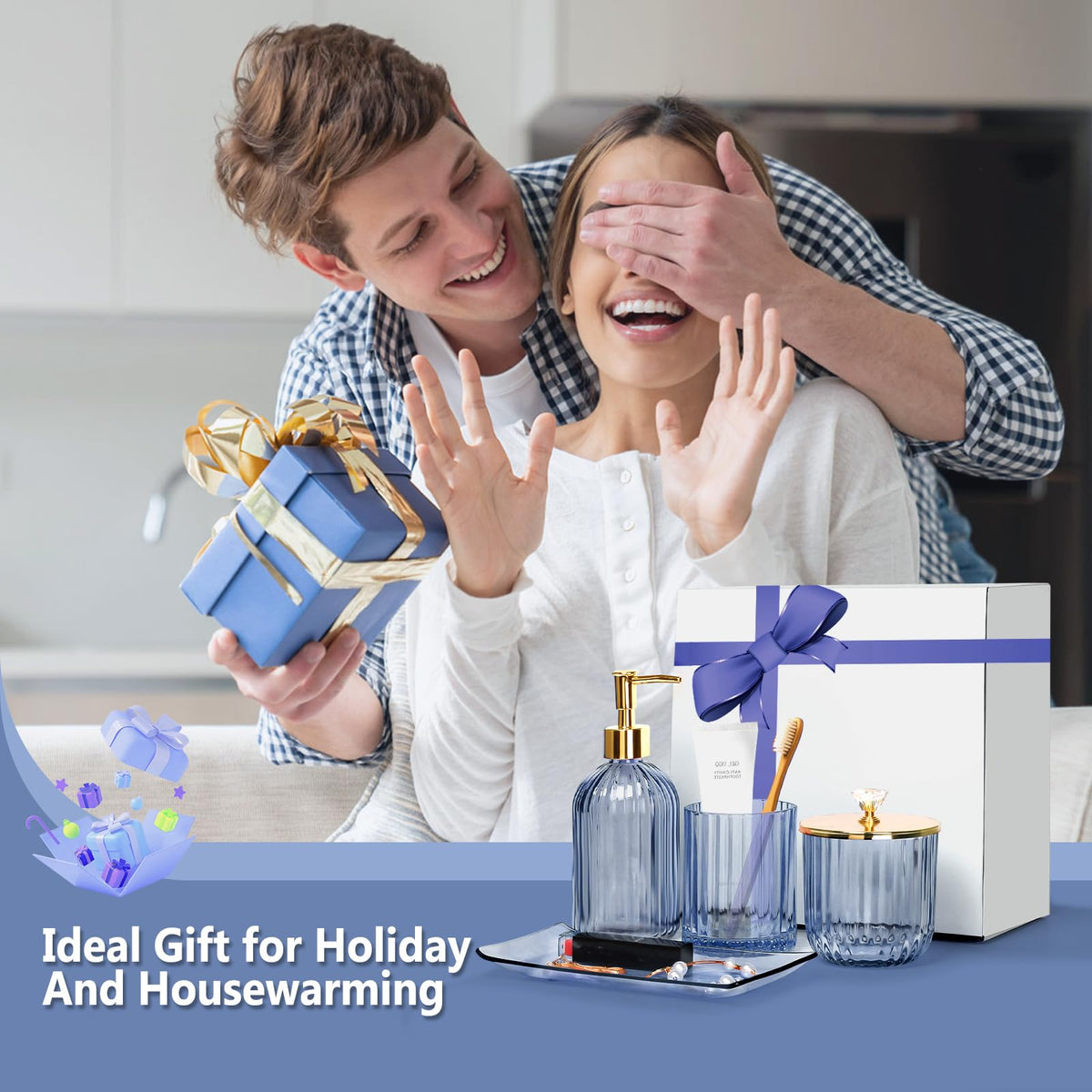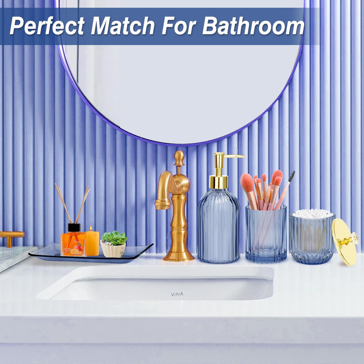Jenseits Blue Bathroom Accessories, 4 Pcs Glass Bathroom Set Complete Includes Soap Dispenser, Toothbrush Holder, Apothecary Jar