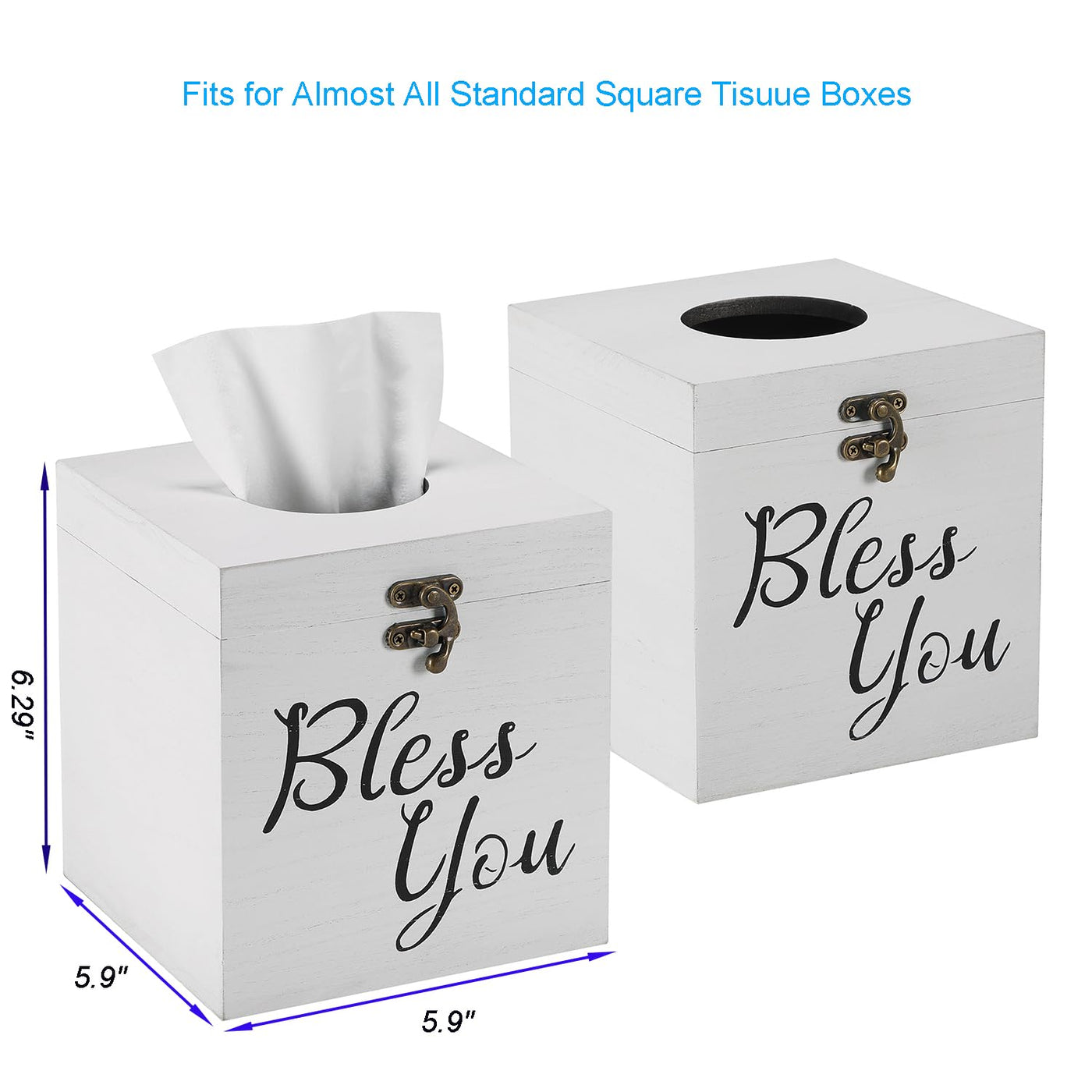 Jorikchuo Set Of 2 Rustic Wood Tissue Box Cover: We Are A Professional Wood Products Manufacturer With A History Of 30 Years. Provide You With High Quality And Practical Farmhouse Toilet Paper Holder Solutions. 1, Organize & Decor Your Home Is Our Mission! 2, Dark Brown Burned Finish With Light Rustic ''Bless You'' Perfect For A Farmhouse! 3, These Wooden Tissue Boxes Cover With Hand Painted Rustic Dark Brown Finish Makes A Welcome Addition To Any Room. Features: Perfect Size, Make Room For Some Personal Style: Upgraded And Optimized, Fits Most Standard Size Square Tissue Boxes. Helps Maintain Rustic Decor While Keeping Facial Tissues Handy For Guests And Family. Adds Farmhouse Bathroom Decor To Your Home: Bring New Life To Your Bathroom, Living Room, Bedroom, Or Any Part Of Your Home With This Simple But Transformative Wooden Tissue Box Cover. ''Bless You'' Sayings. Antique Copper Lock Design: Wood Facial Tissue Box Holder With ''Bless You'' Sayings. Copper Lock Design Is Adopted For Opening And Closing, Which Is More Beautiful And Durable Than Other Slide-Out Bottom Designs. Rustic Vintage Look: This Rustic Tissue Box Cover Has Been Crafted From Distressed Wood To Give It A Vintage Look. Ready To Complement Your Home With Some Farmhouse Decor. Material:100% Solid Wood Size: Exterior: 5.9L X 5.9W X 6.29H Inches; Interior: 5.35L X 5.35W X 5.74H Inches Packaging Includes: 2 X Tissue Box Cover In Dark Brown Finish Notice: Your Satisfaction Is Our Priority, 24 Hours Seller Support At Your Service. So Enjoy Your Risk-Free Purchase! Would You Like To Put This Tissue Box In Your Home As A Rustic Decoration? Do You Want To Decorate Your Ugly Tissue? If The Answer Is Yes, What Are You Waiting For?