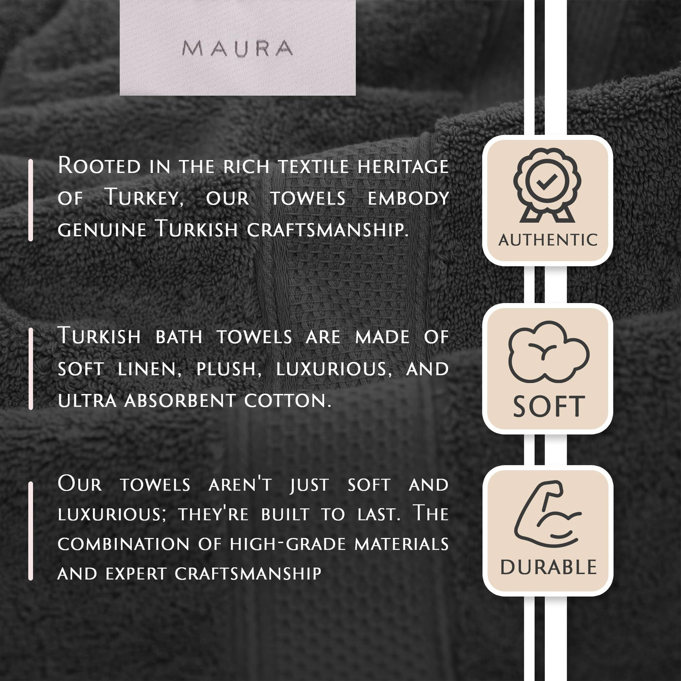 Q: What materials are used in the MAURA bath towels?A: These towels are crafted from 100% Turkish cotton, providing a soft, plush, and highly absorbent experience, making them ideal for luxury bathroom settings.