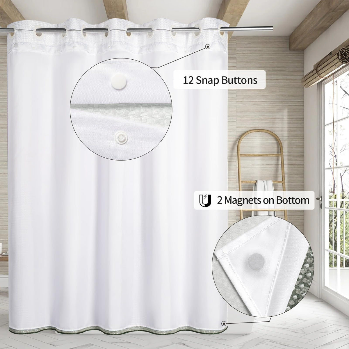 Q: What material is the shower curtain made of?A: The shower curtain is made of heavyweight waffle fabric that is both durable and waterproof, providing a luxurious and spa-like feel in your bathroom.