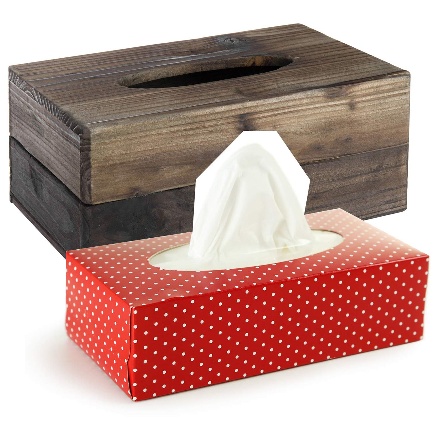 Q: What materials are used in the MyGift Tissue Box Cover?A: The MyGift Tissue Box Cover is crafted from premium dark torched solid wood, featuring a distressed honey brown finish that combines durability with rustic charm.