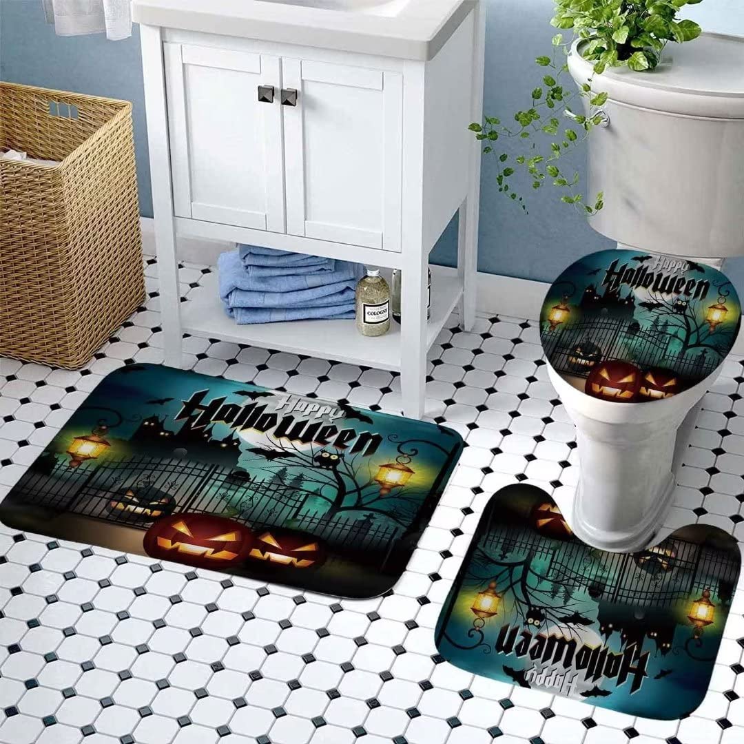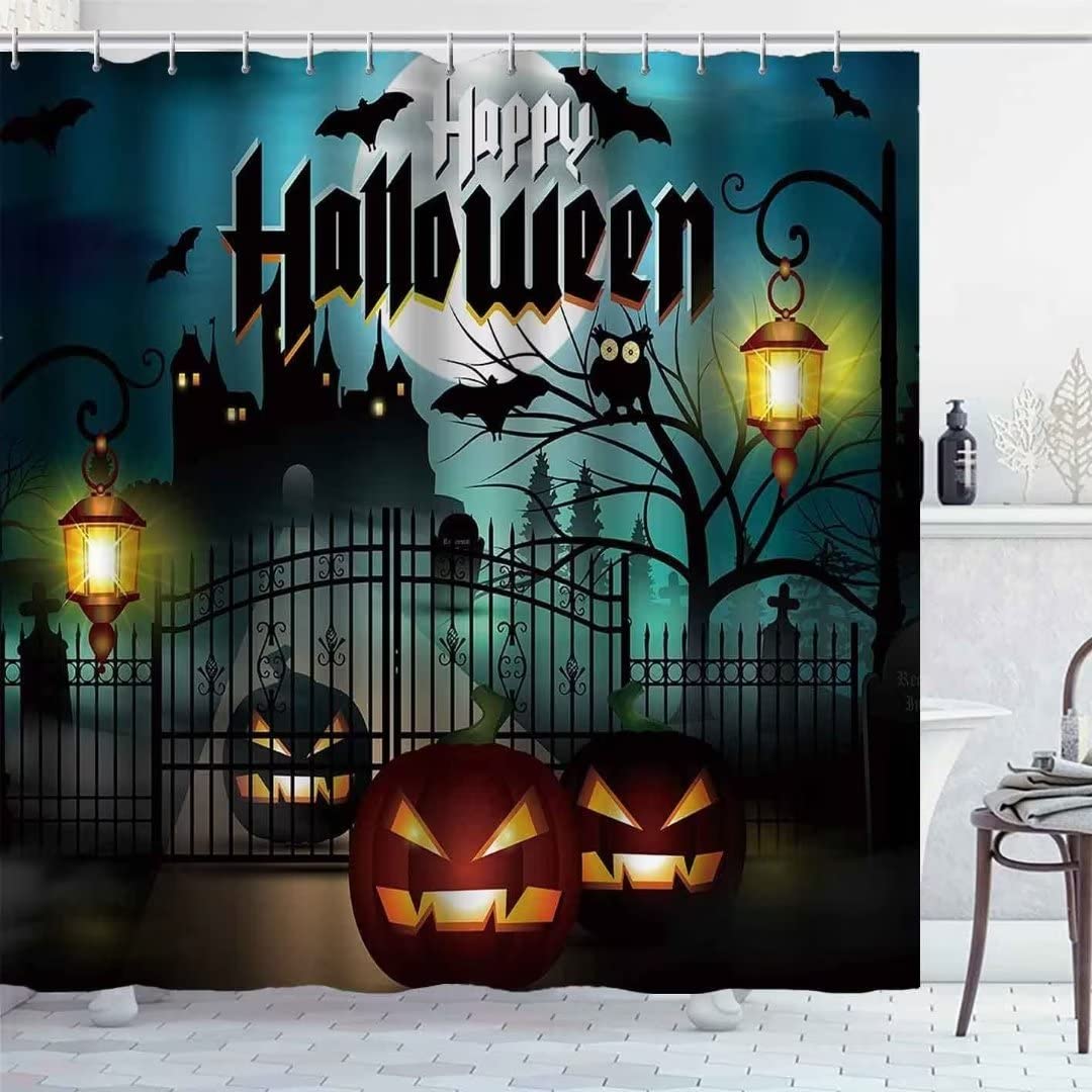 Nbvko Halloween Castle Pumpkin Waterproof Shower Curtain,With Non-Slip Rugs,Toilet Lid Cover And Bath Mat,Bathroom Shower Decor