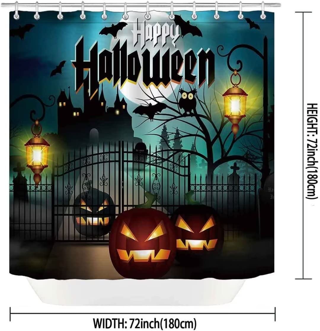 Q: What size is the NBVKO Halloween Castle Pumpkin Shower Curtain?A: The NBVKO Halloween Castle Pumpkin Shower Curtain measures 70.8 x 70.8 inches, making it suitable for most standard shower sizes.