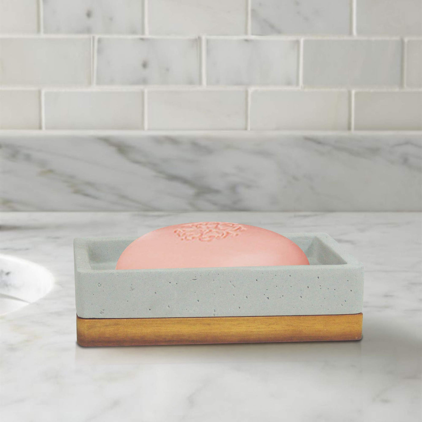 Q: Is the nu steel soap dish suitable for different bathroom styles?A: Yes, the nu steel soap dish features a neutral design with a grey cement and wooden trim that complements various decor styles, including industrial, boho, and modern aesthetics.