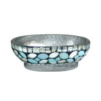 Q: What materials are used in the nu steel Sea Foam Soap Bar Dish?A: The nu steel Sea Foam Soap Bar Dish is made from premium stainless steel combined with intricate mosaic glass inlays. The glass features a teal, aqua, and silver color scheme, all set in durable black resin, ensuring both elegance and quality.