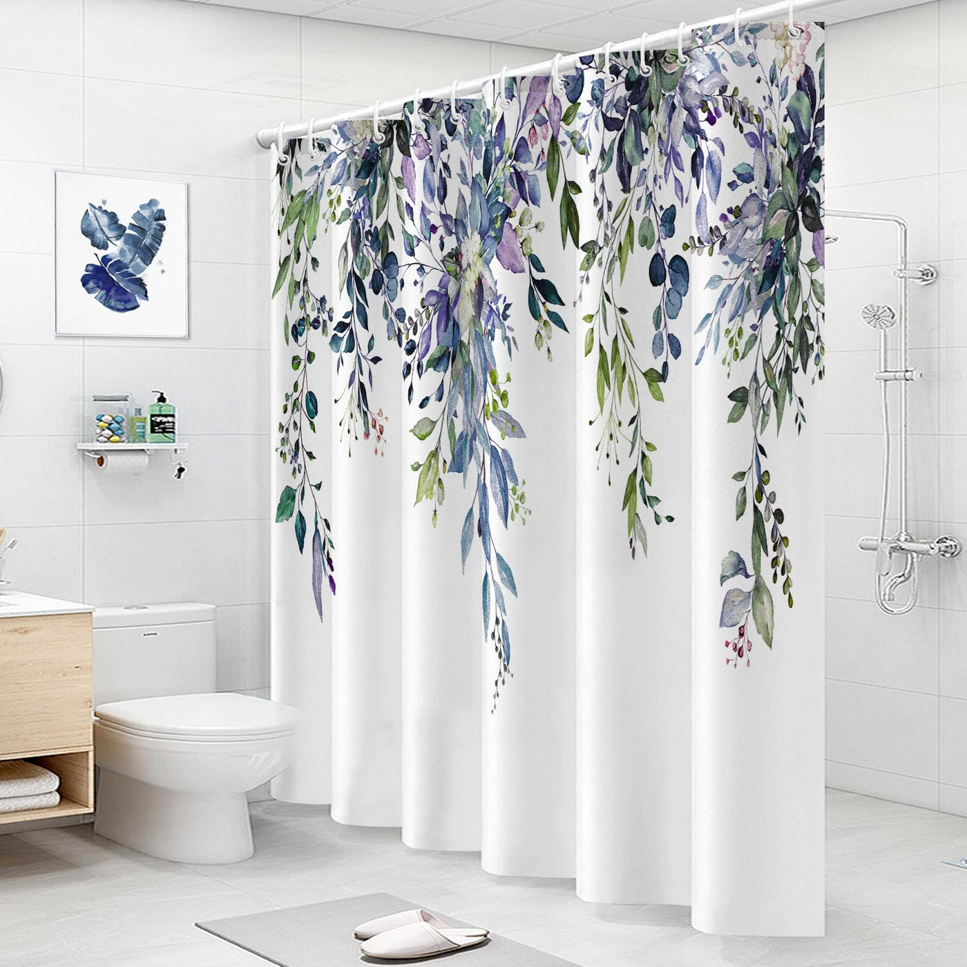 Q: Is this shower curtain waterproof?A: Yes, the eucalyptus leaves shower curtain is designed to be waterproof, allowing water to glide off easily and dry quickly, enhancing your shower experience.