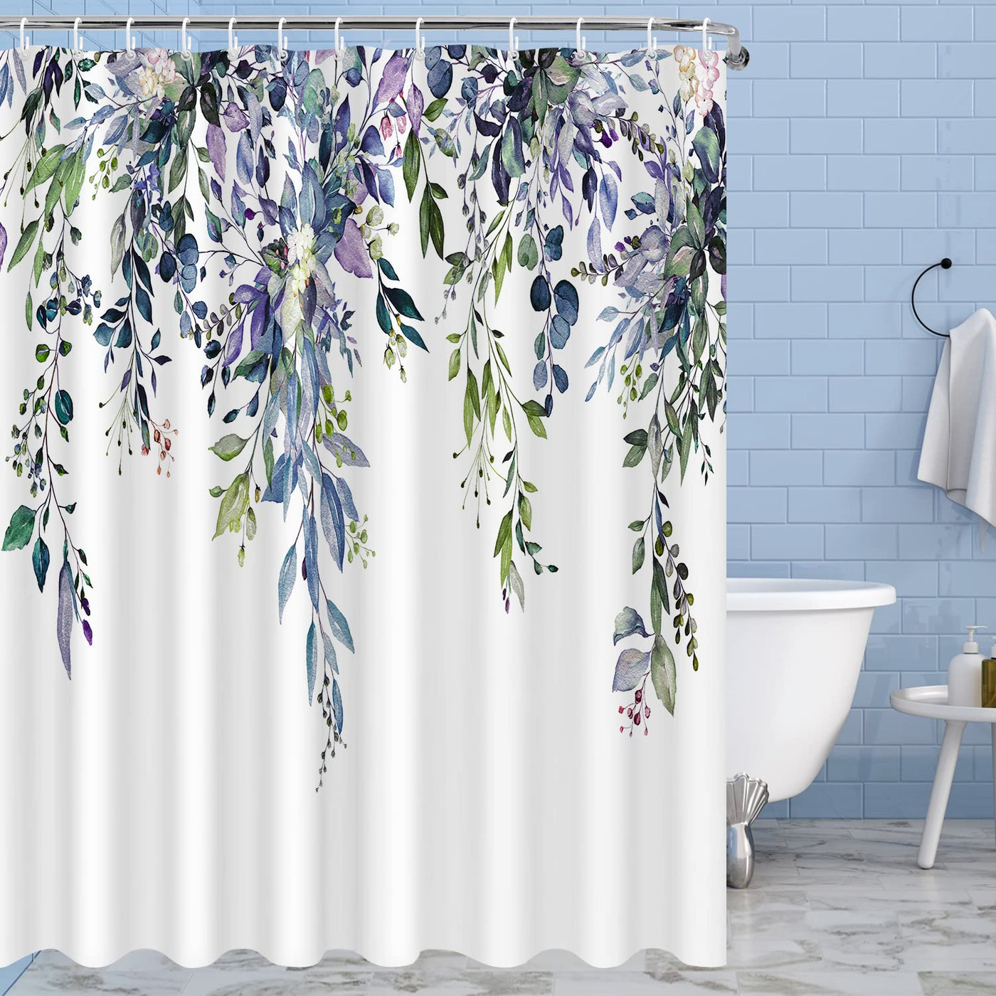 Nuseiis Blue Purple Eucalyptus Leaves Shower Curtains, Fabric Shower Curtain Modern Shower Curtain Sets, Stylish Floral Background Bathroom Decoration With 12 Shower Curtain Hooks, 72X72 Inch