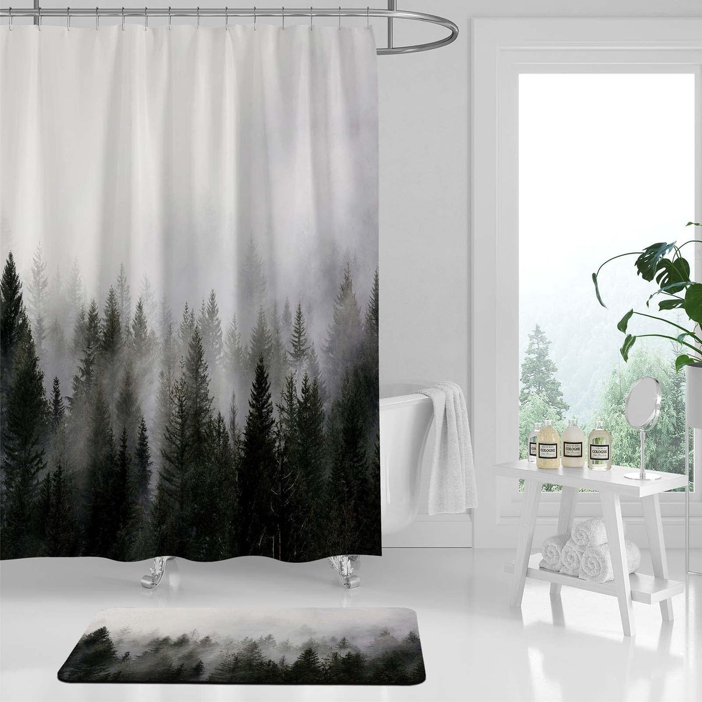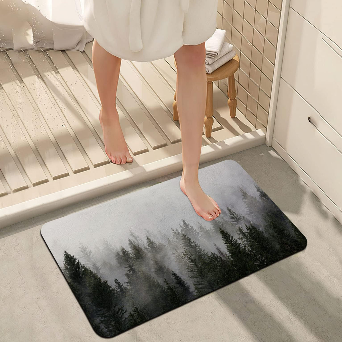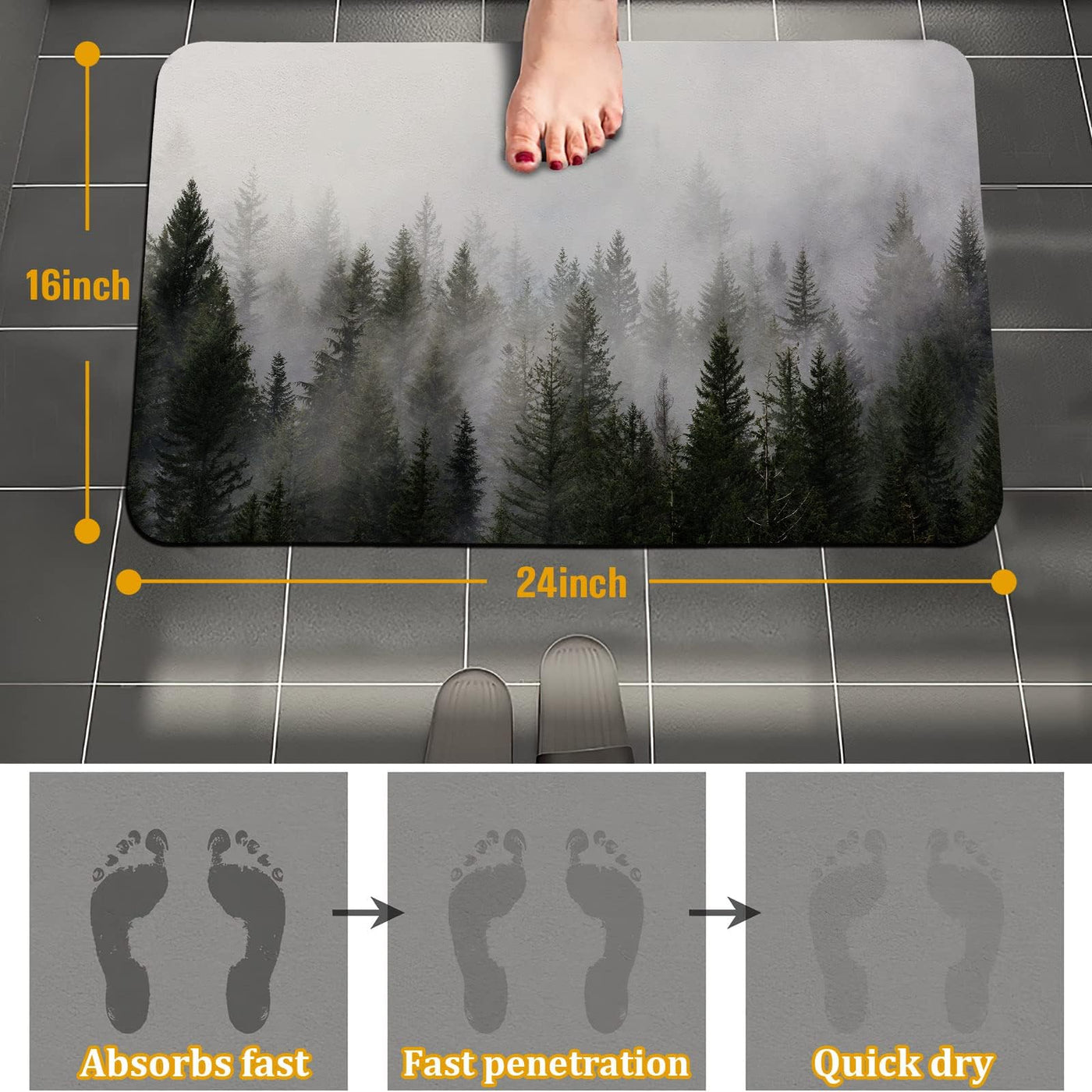 Advantages Of Our Bath Mats: 1.Luxury Material-No Pilling 2.Super Absorbent-No Fading 3.Fast Drying-No Smelly 4.Breathable-No Shedding 6.No Bent-Non Slip Rubber Misty Forest Bathroom Decor Set This Misty Woods Bath Mat Has A Matching Shower Curtain,Make The Bathroom Style More Unified And Harmonious, And Show Your Taste.
