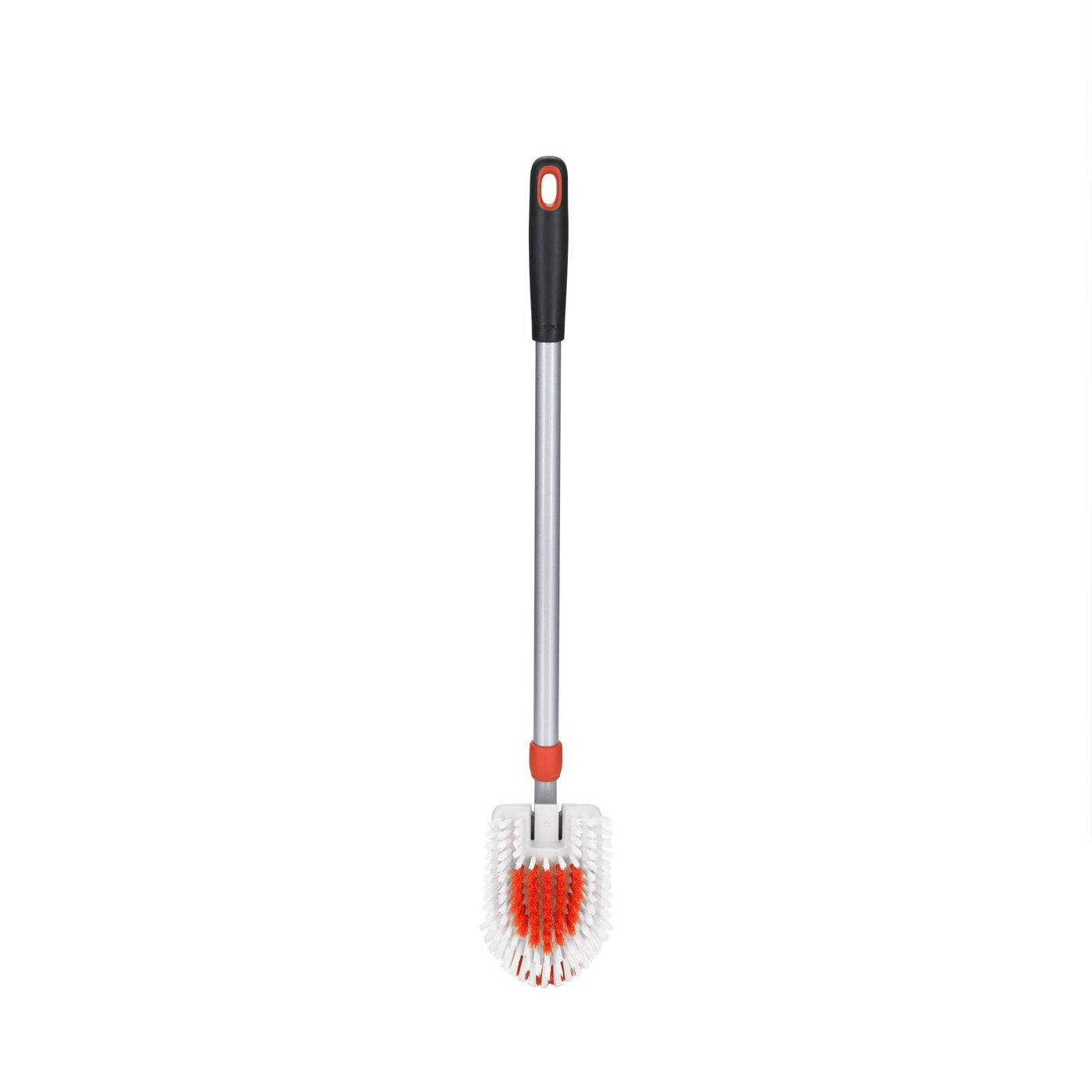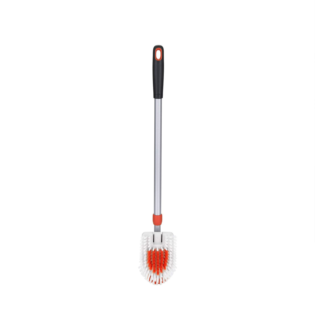 Q: Is the scrubber head adjustable for different cleaning angles?A: Yes, the head of the OXO Good Grips Extendable Tile & Tub Brush pivots, allowing you to clean at various angles. This feature helps you reach difficult spots and ensures a thorough cleaning experience.