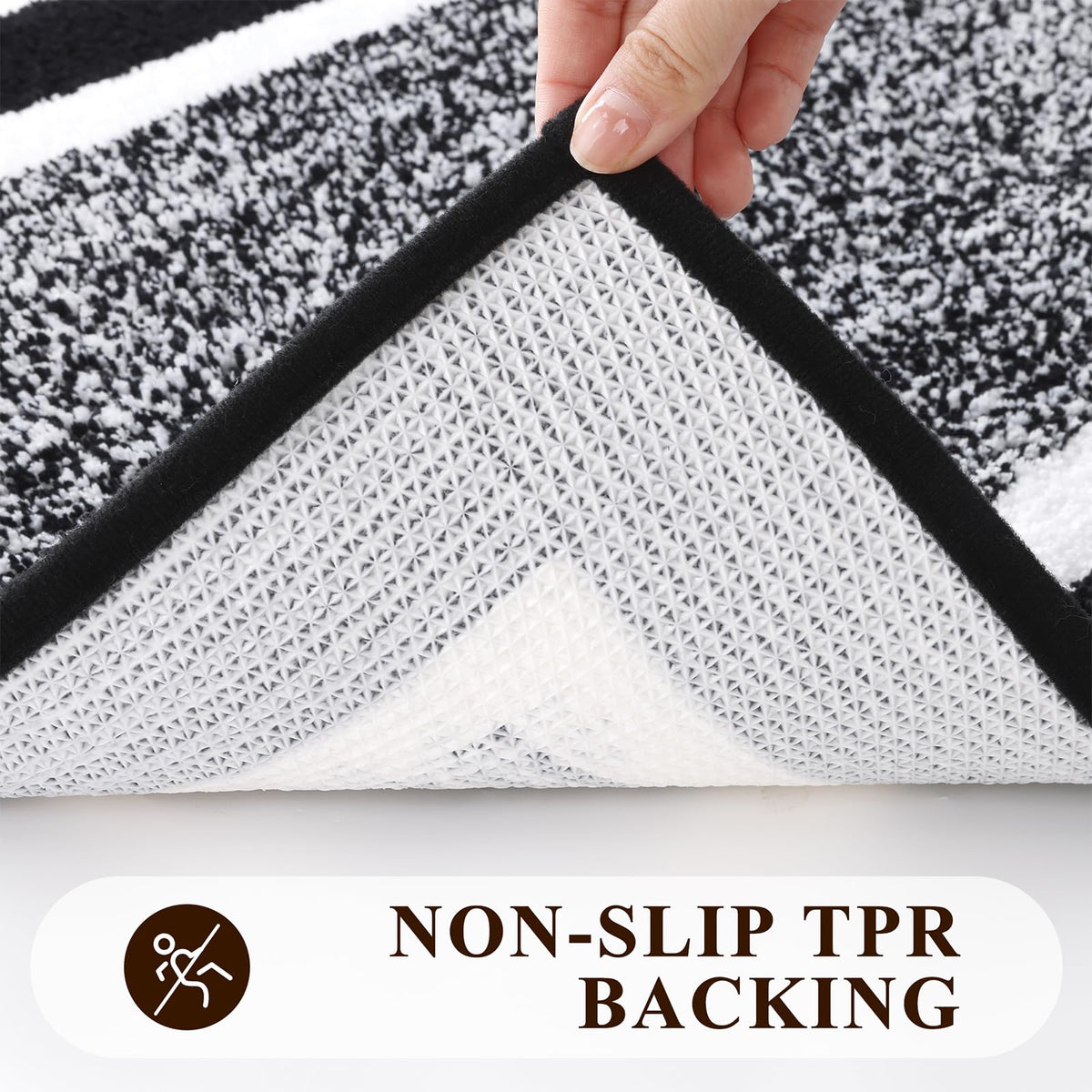 Q: How do the non-slip features of the bathroom mats work?A: The bathroom mats feature an upgraded TPR non-slip backing that provides strong anti-slip performance, keeping the rugs securely in place on the floor to prevent slipping.