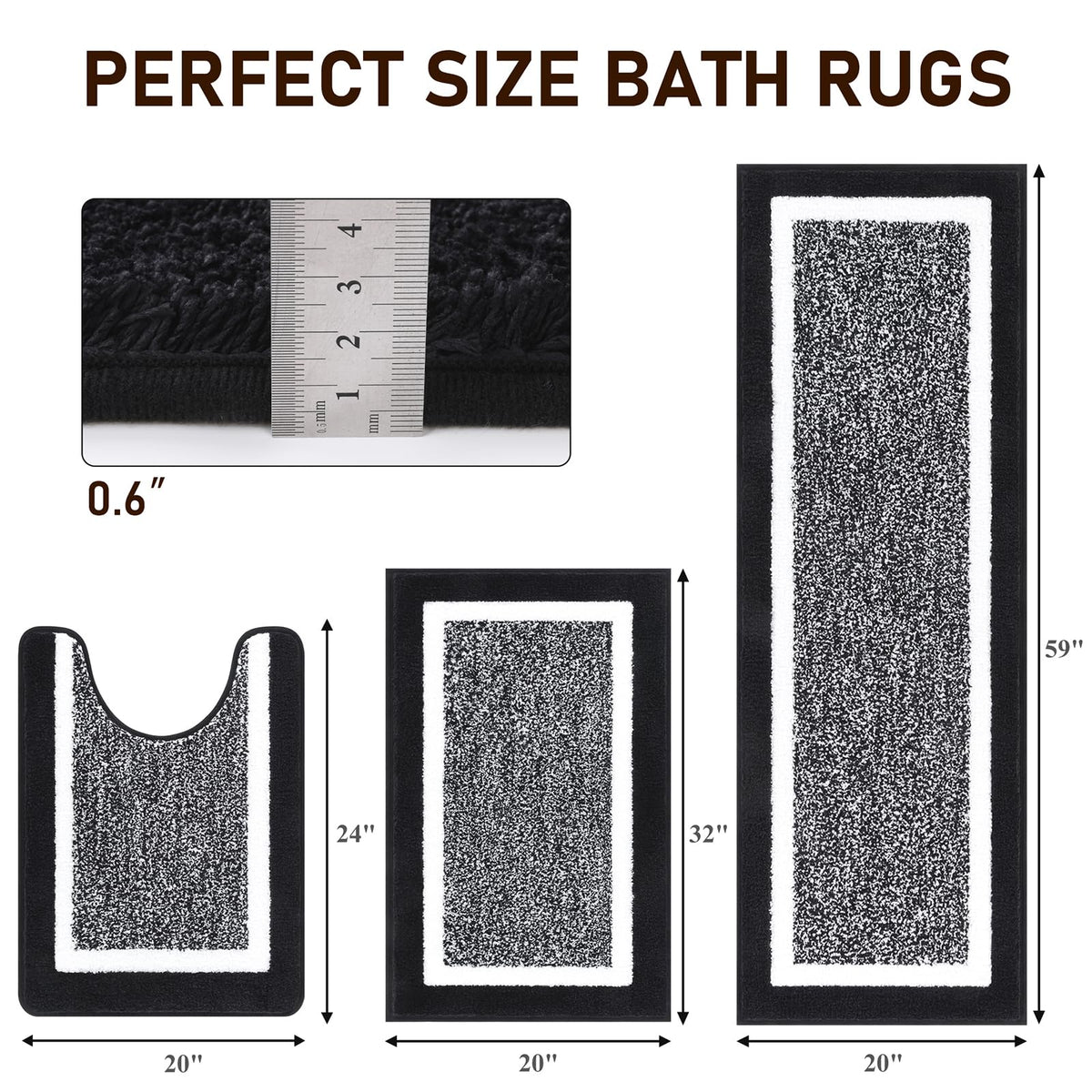 Q: What are the dimensions of the Pauwer Bathroom Rug Set?A: The Pauwer Bathroom Rug Set includes three pieces with dimensions: 20"x32" for the first mat, 20"x59" for the second mat, and a U-shaped mat measuring 20"x24".