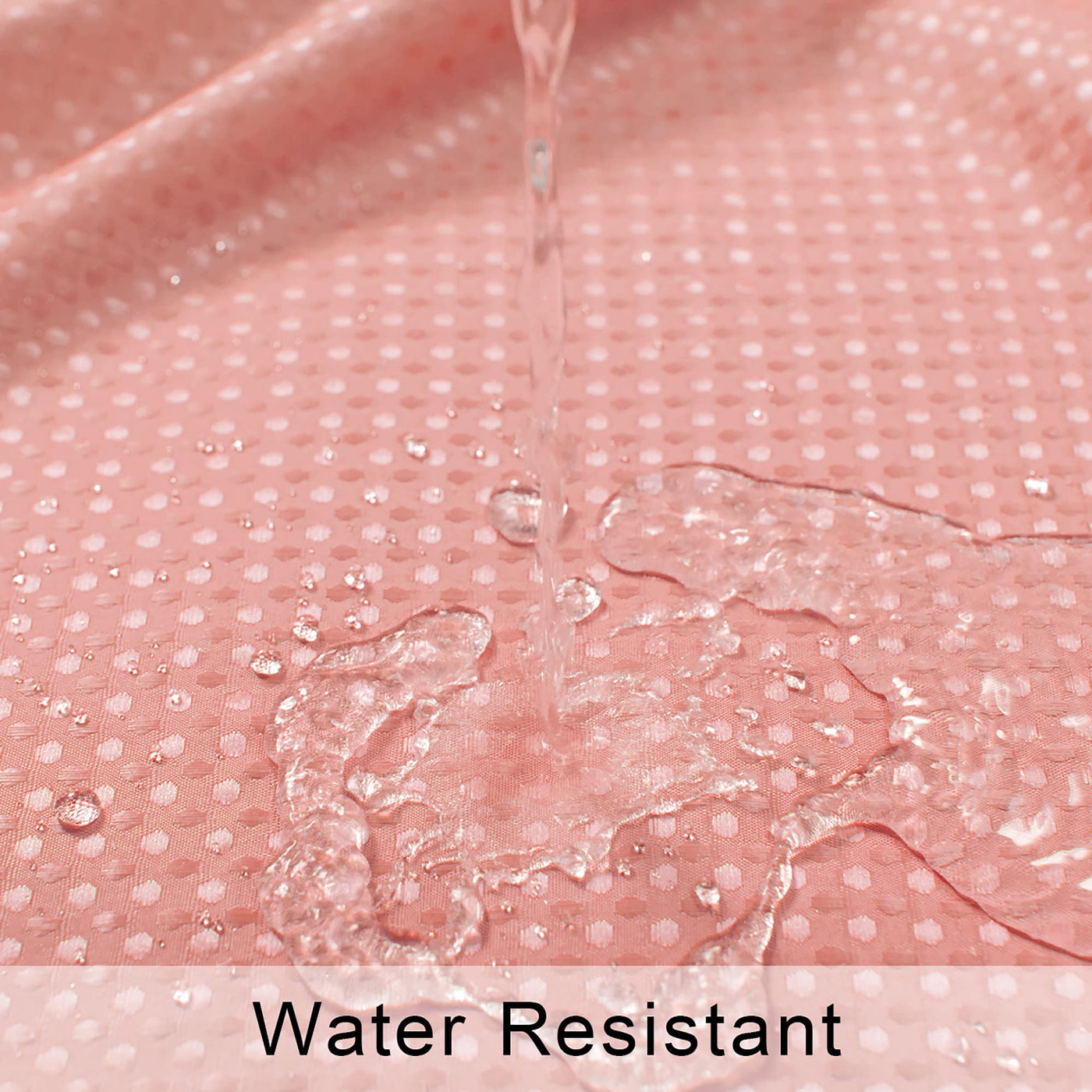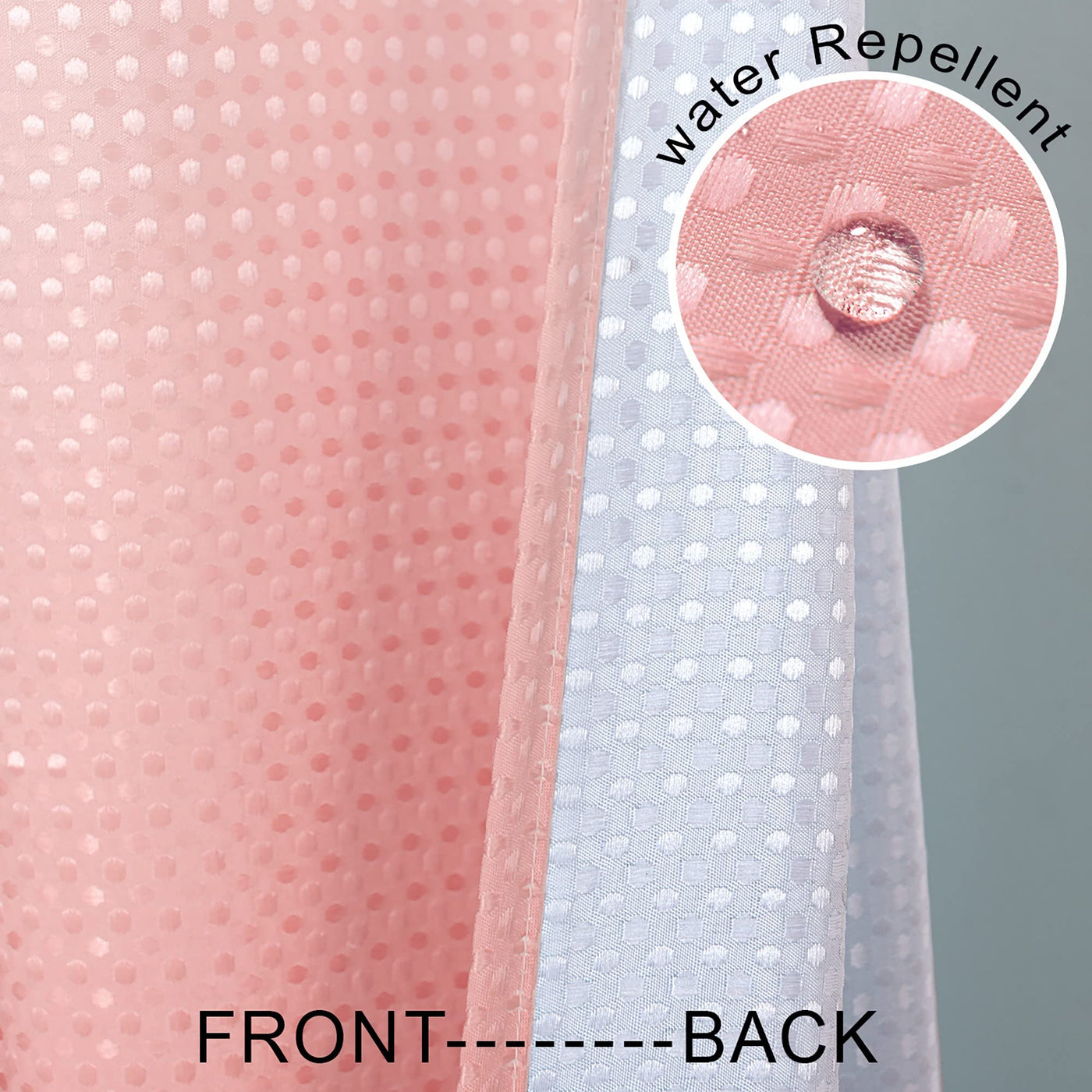 Q: What material is the Pink Dorm Shower Curtain made of?A: The Pink Dorm Shower Curtain is made of a durable, washable, and waterproof polyester fabric that features a dot pattern waffle weave texture, providing both functionality and aesthetic appeal.
