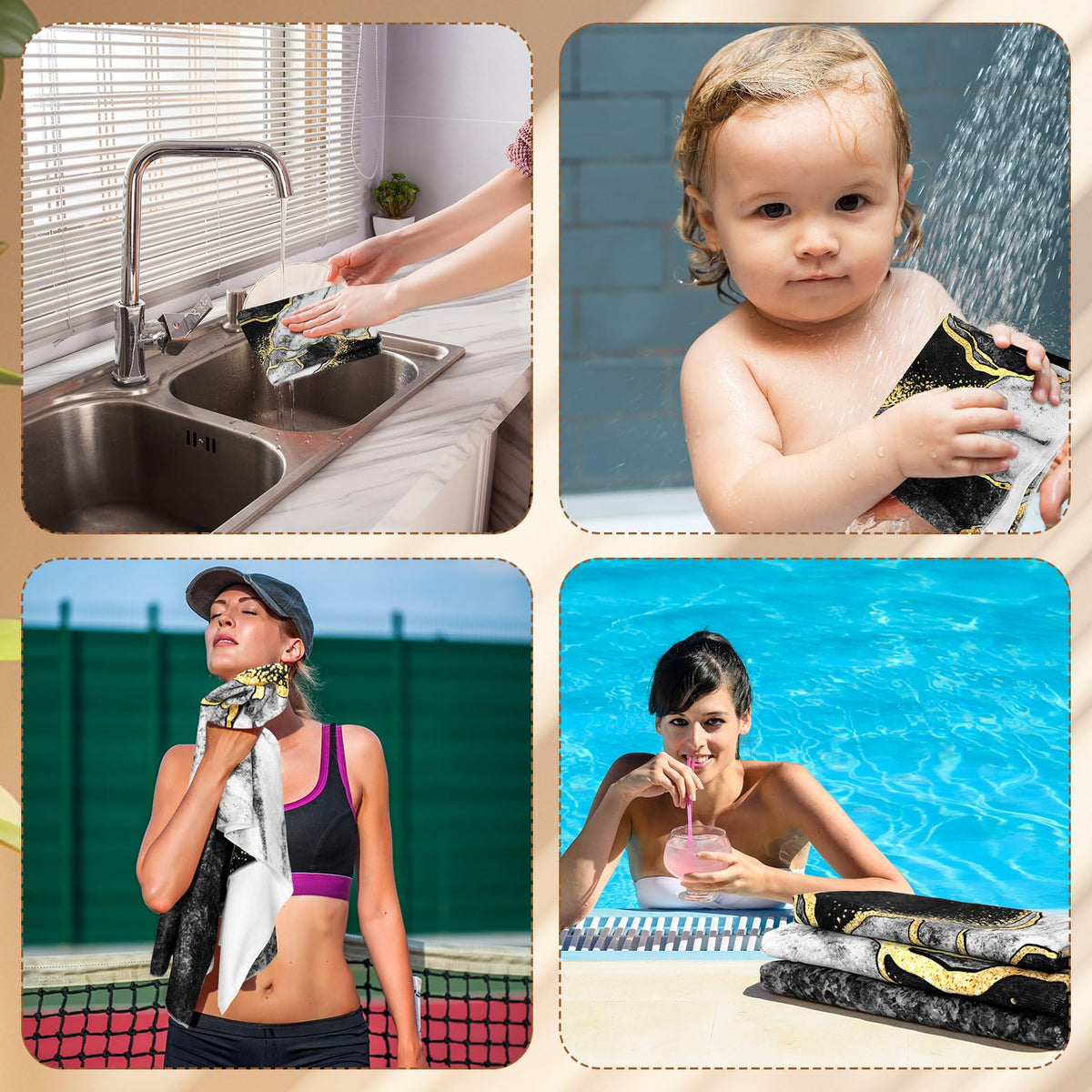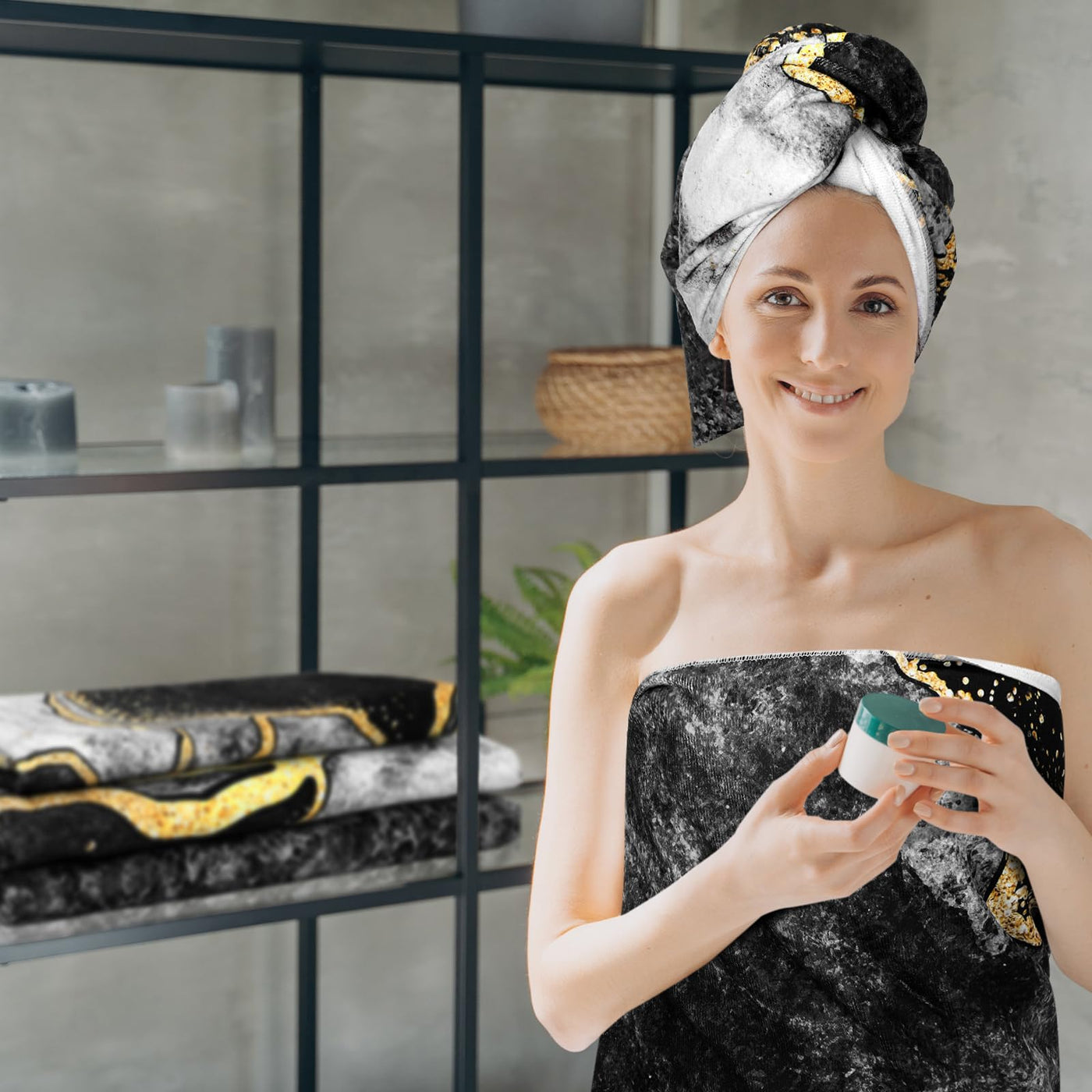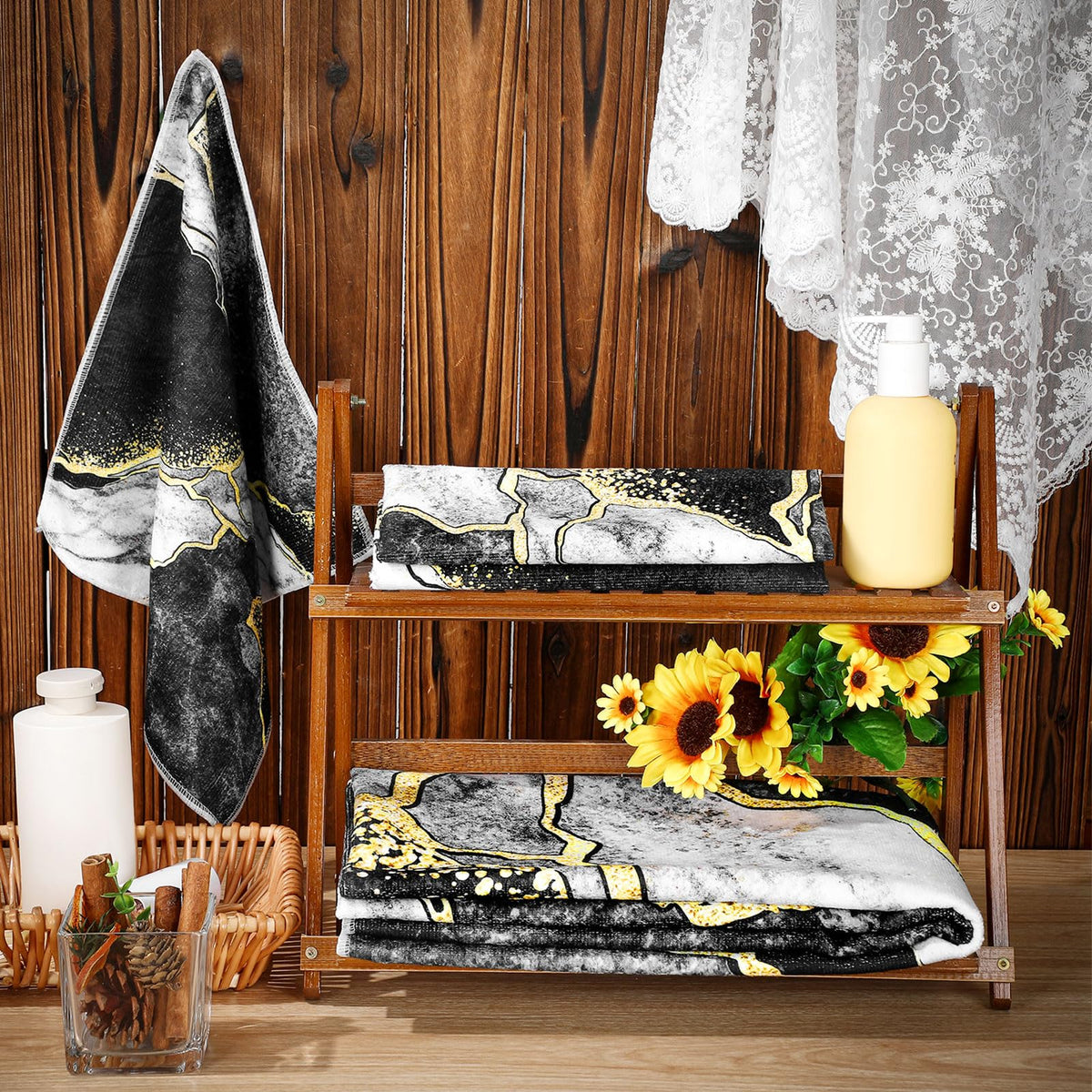 Q: What makes these towels a great gift option?A: These towels make a thoughtful gift due to their elegant black marble design with gold accents, practical sizes, and comfort, making them suitable for occasions like housewarming parties, weddings, or birthdays.