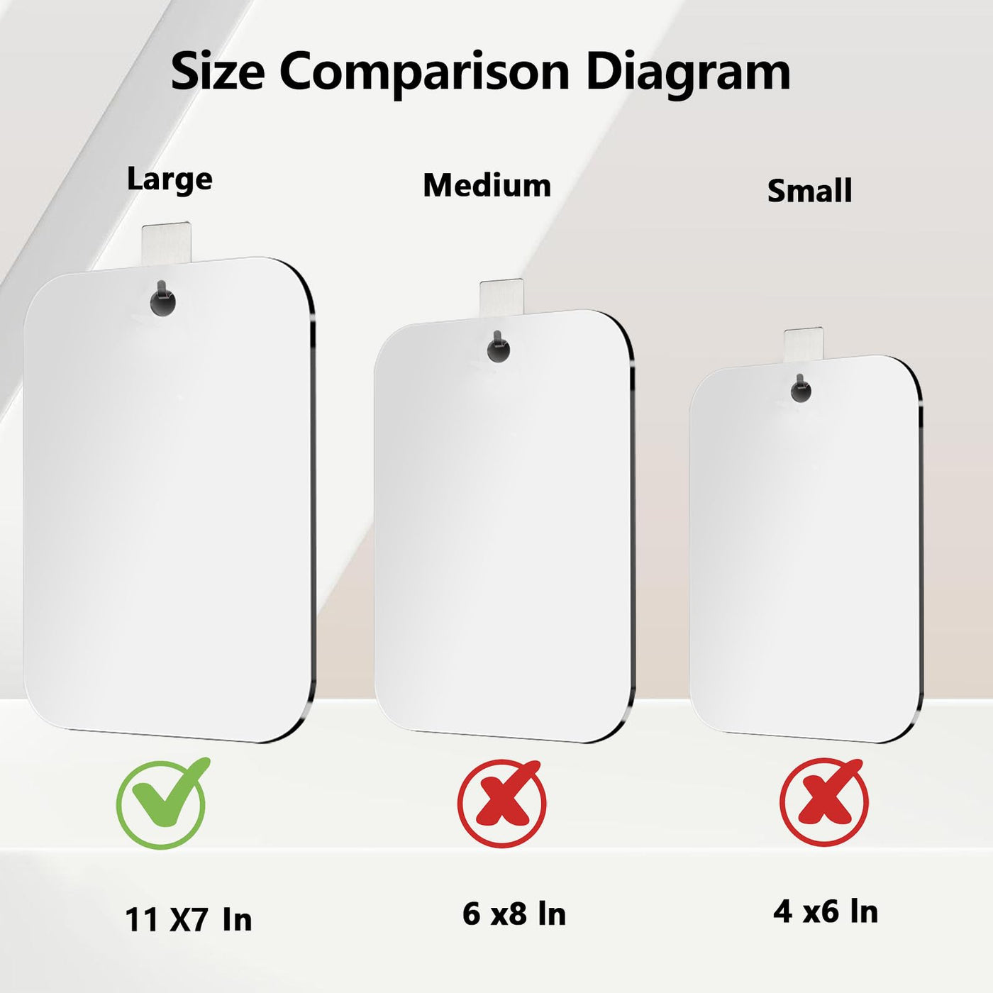 Q: What are the dimensions of the shower mirror?A: The shower mirror measures 8 inches in length and 6 inches in width, making it a medium size that's easy to handle and fit into various bathroom spaces.