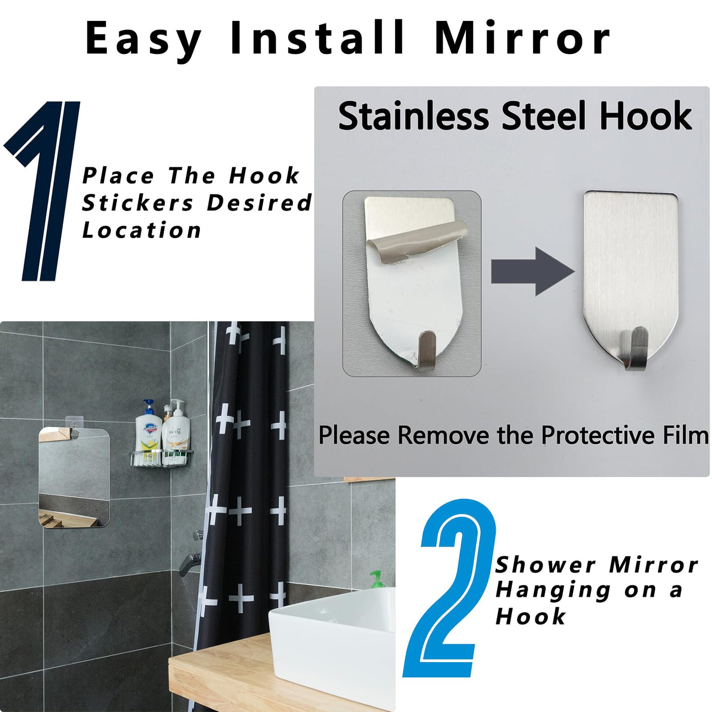 Q: How do I clean and maintain the shower mirror?A: To clean the shower mirror, simply tear off the protective film before first use and wash it with warm water. It's easy to maintain and can be kept clear for optimal use.
