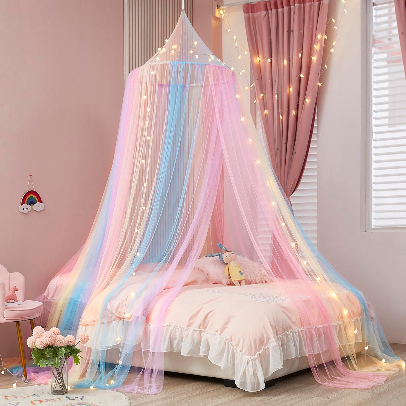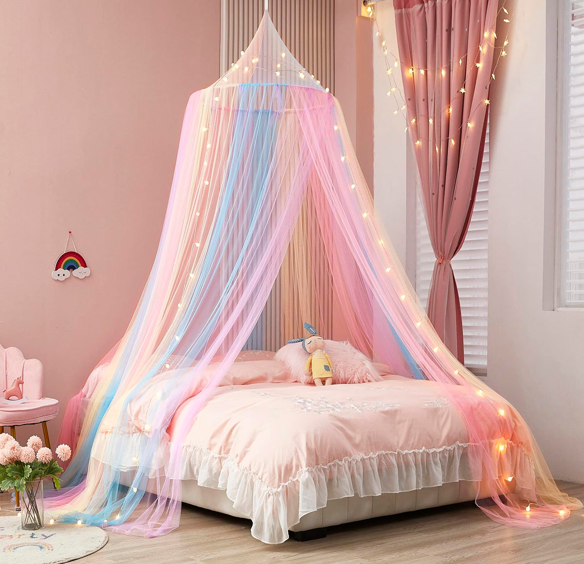 Rainbow Bed Canopy For Girls, Bed Canopy With Lights Canopy For Girls Room Bed Mosquito Netting For Twin Single Full Queen King