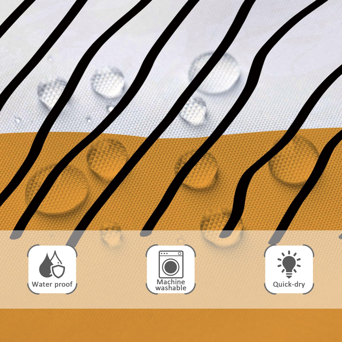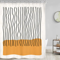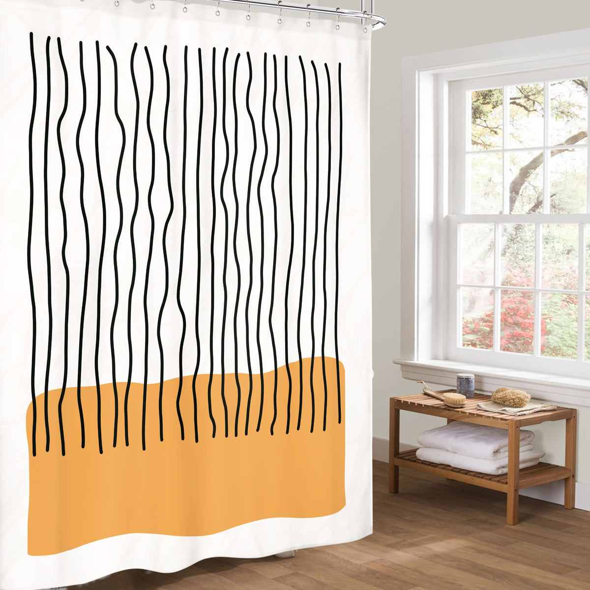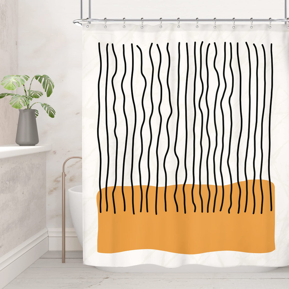 Q: What design style does the shower curtain feature?A: This shower curtain showcases a mid-century theme with a striking orange block and black lines pattern, making it a stylish addition to your bathroom decor.