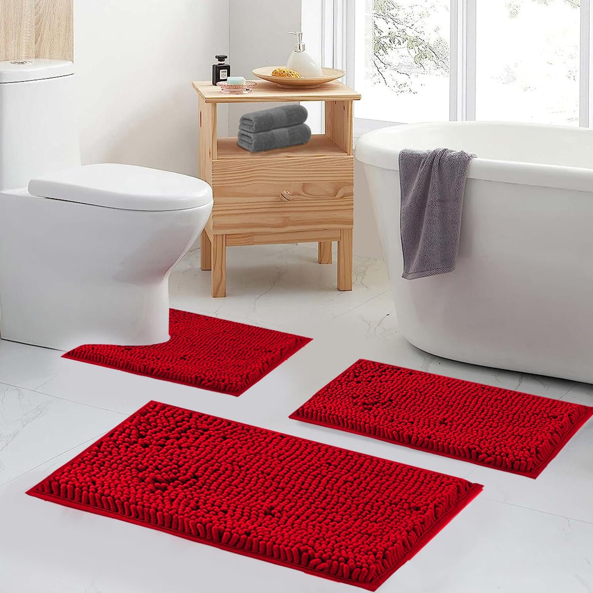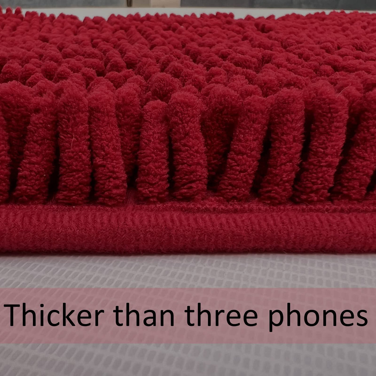 Q: What material are the RUN HELIX bathroom rugs made from?A: The RUN HELIX bathroom rugs are made from thick chenille fabric with individual microfiber piles, providing a super soft and plush feel, as well as excellent water absorbency.