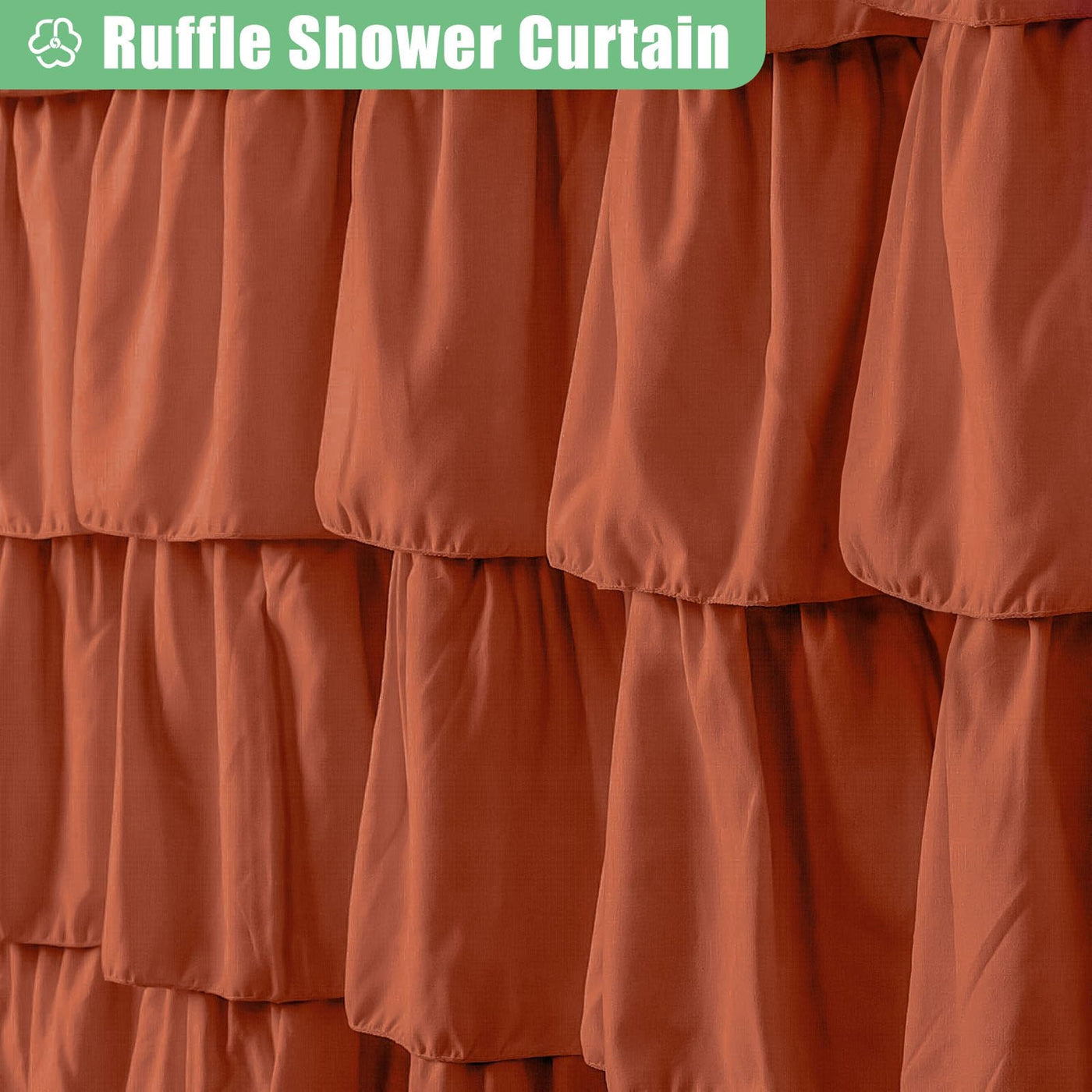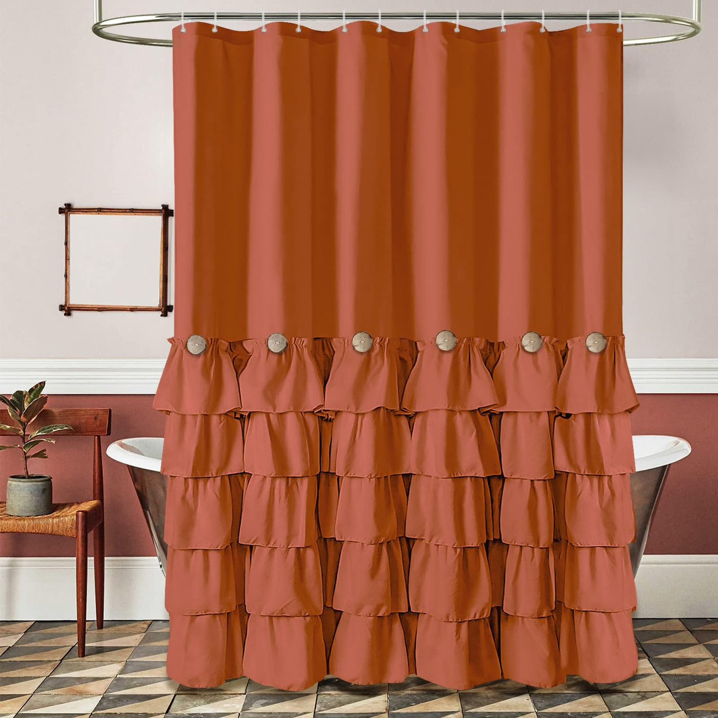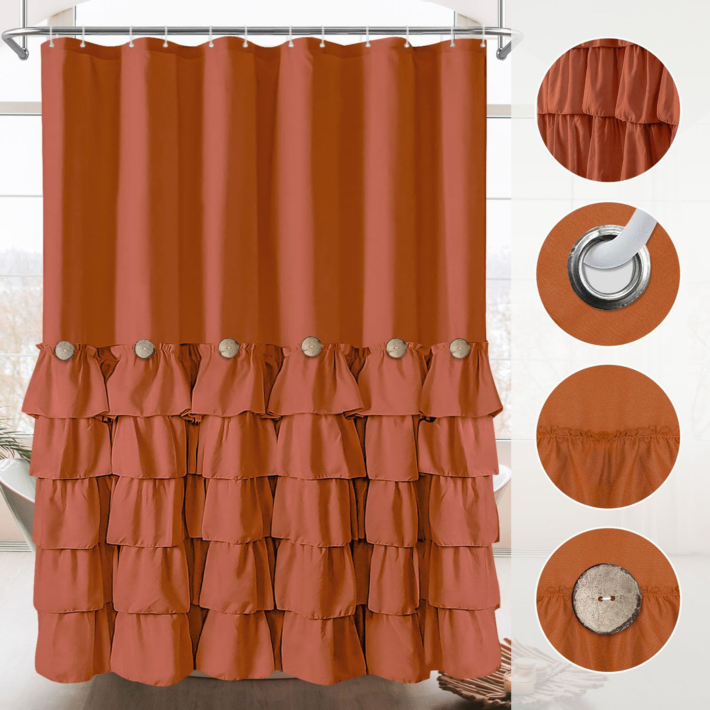 Q: What is the design style of this shower curtain?A: This shower curtain features a rustic farmhouse design with handcrafted waterfall ruffles and vintage coconut buttons, providing a charming shabby chic aesthetic.
