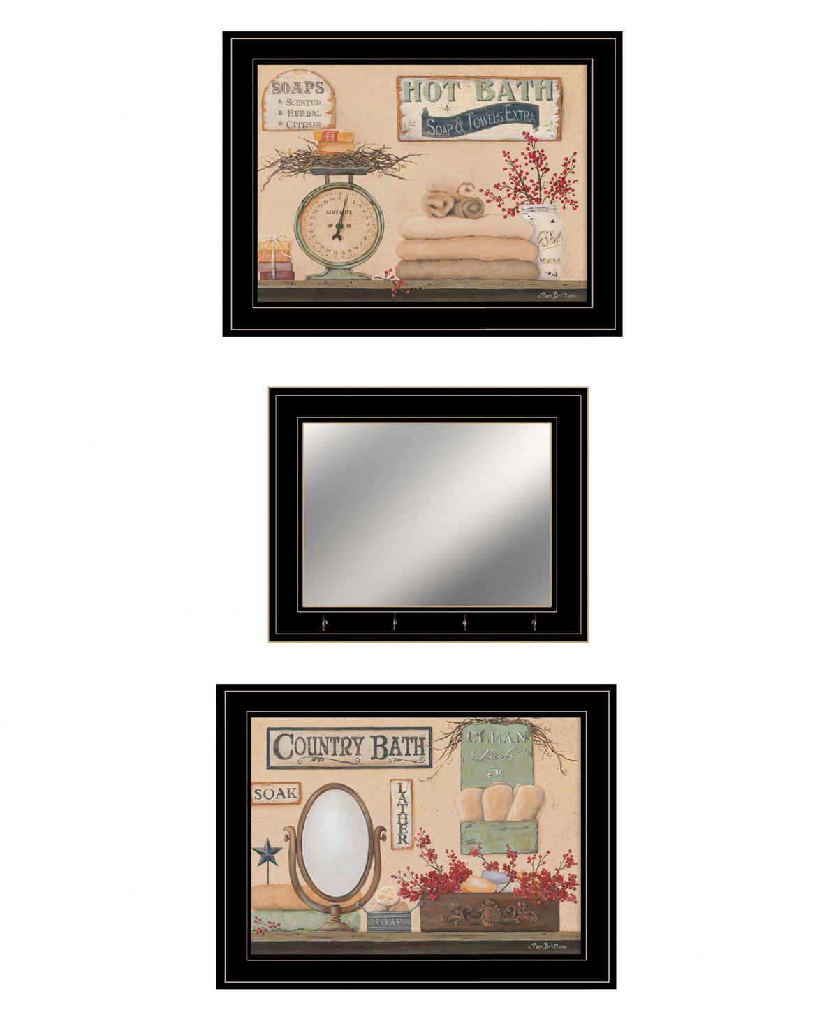 Add an air of fashion to your room and rejuvenate the space with this set of three wash room with black rimmed frames bathroom wall art. This decorative set is unique that it includes two prints and mirror that allows you to decorate your space in reproduced for you on paper, the hanging decorative prints will be a trendy and fashionable way to dress your bathroom wall. The mirror includes 4 hooks to hold towels or clothes.