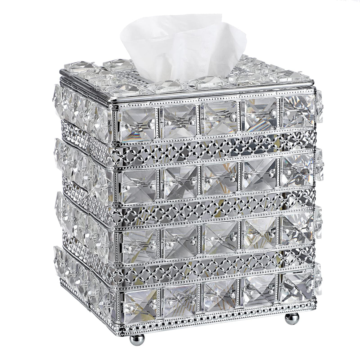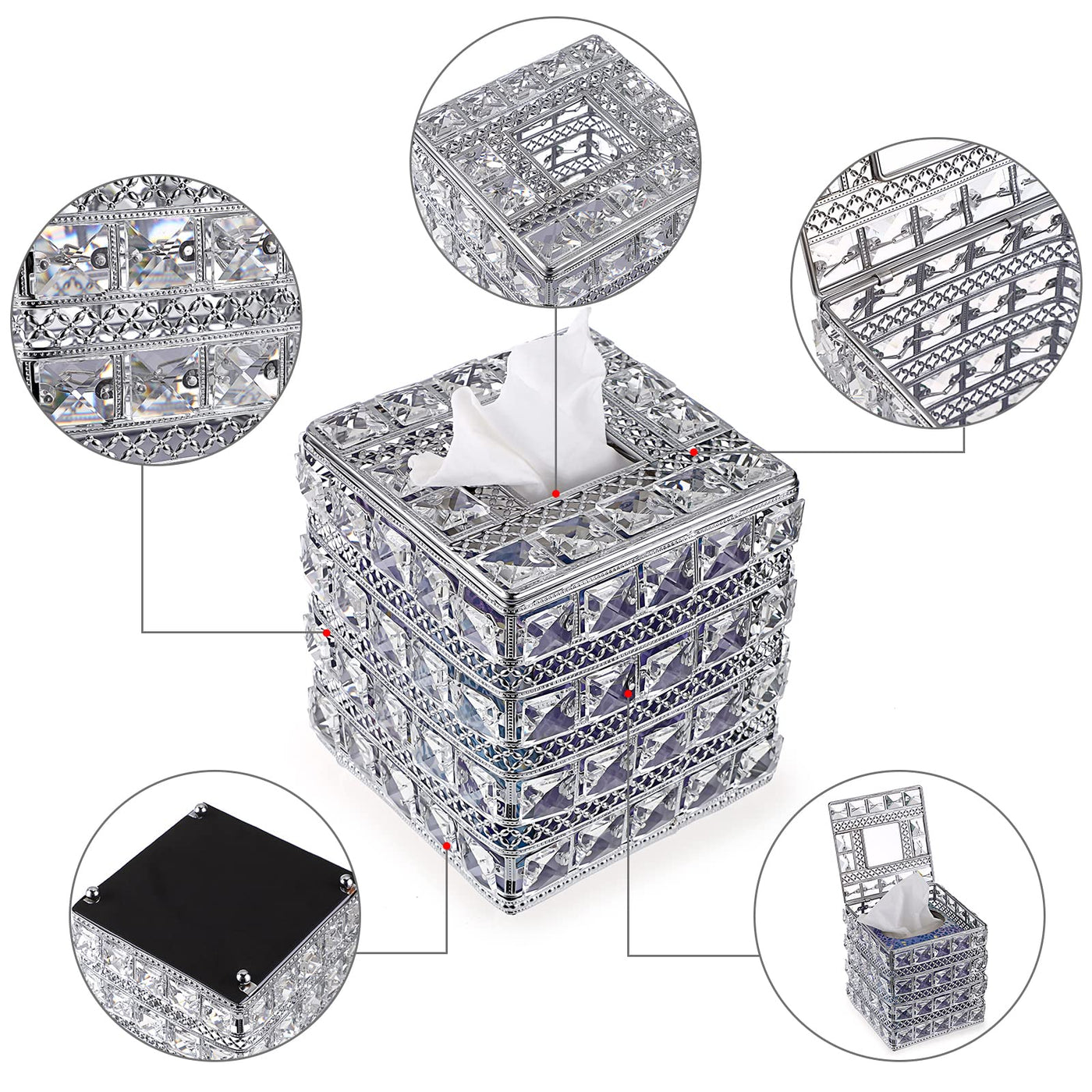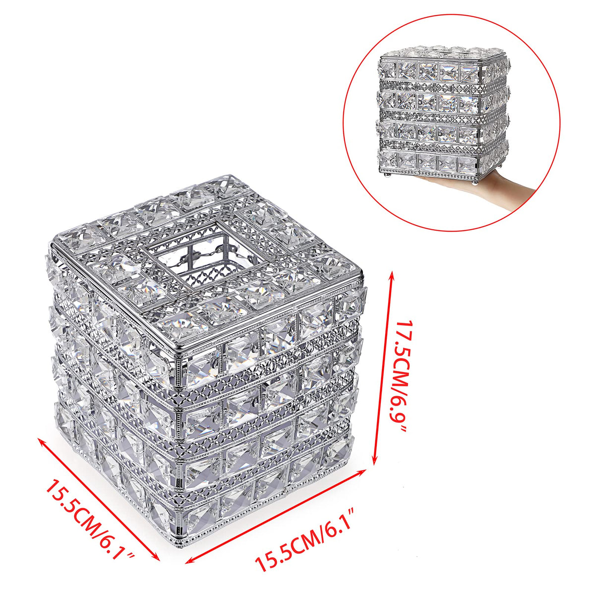Descriptions:??The Stunning Tissue Box Cover Is Made Of High Quality Artificial Crystal + Stainless Steel.?? It'S Solid And Sturdy, The Crystal Is Really Sparkle, And It Turns A Batch Of Tissues Into A Decor Piece. ??Modern & Elegant Design - This Tissue Holder Has A Very Luxe And Sparkling Look, It'S Not Only A Tissue Holder In You Home, But Also A Pretty And Bling Decoration To Any Place You Put, Will Add A Nice Decorating Touch To Your Home Without Being Too Chintzy. ??Good Gift: The Attractive Crystal Facial Napkin Tissue Holder Is Really A Perfect Gift Which You Can Share With Your Family And Friends, It Will Complement Your Home Decor Very Well, Will Also Add Beauty And Color To Your Home.The Sparkle Glass Crystal Tissue Box Is Not Only Can Be Used In Your Home Like: Bathroom, Living Room, Dresser, Night Stand, Table, But Also Perfect As Wedding Table Centerpiece Or Venue Decoration. Specifications??Material: Artificial Crystal + Stainless Steel??Color: Silver?? Product External Size: 6.1 X 6.1 X 6.9 Inch/15.5 X 15.5 X 17.5 Cm(L X W X H);Suitable For??Restaurant, Office, Household, Hotel Rooms Tissue Storage Consolidation. ??And It'S Really An Ideal Gift For House Warming, Wedding, Anniversary, Special Occasions, Christmas, New Year. Package Included: 1 X Crystal Square Tissue Box Cover